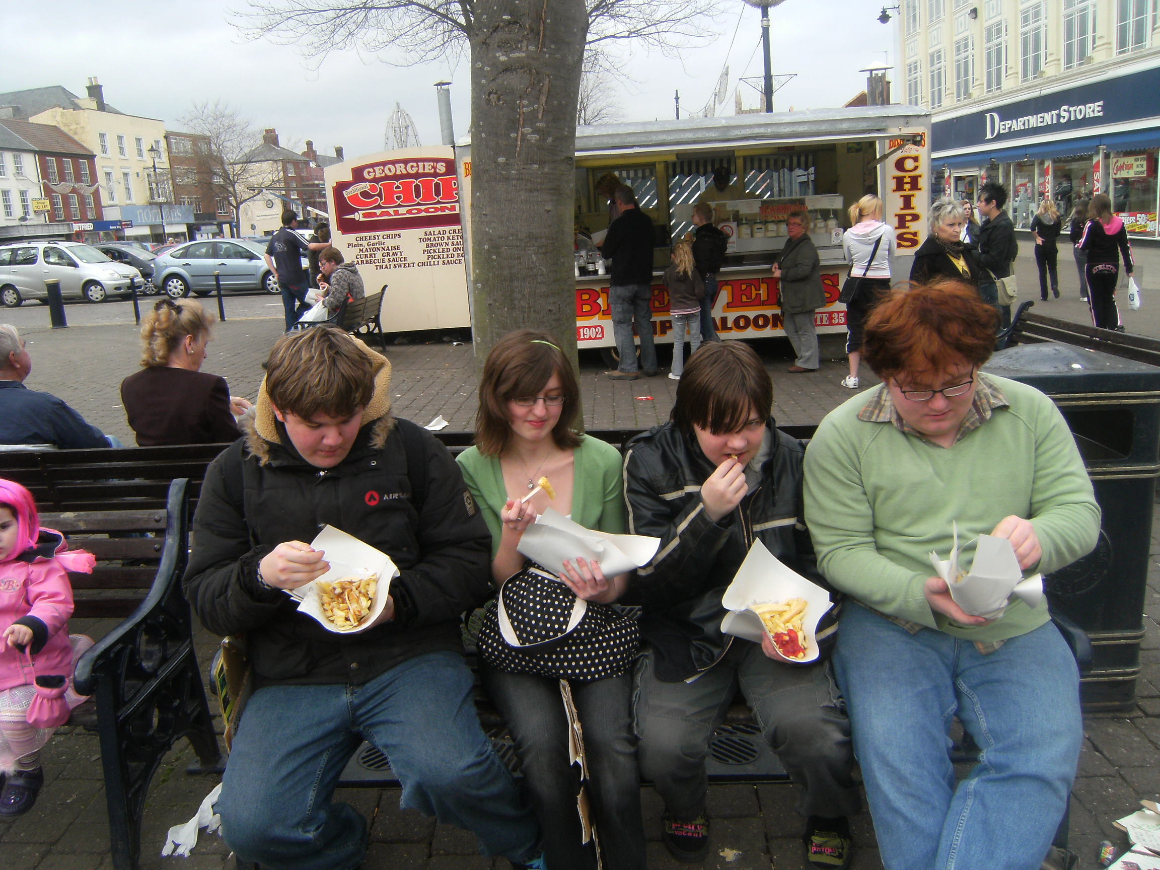 After finishing writing on them (and remeniscing about WEG), we left Tom's house, and walked to the Market Place. We were all pretty hungry after the TV smashing, so what better way to appreciate Great Yarmouth than to have chips on the market!