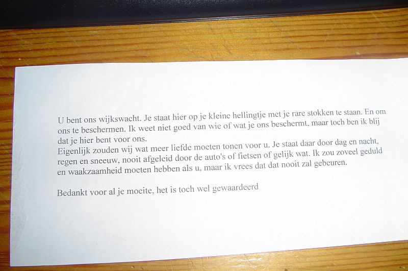 Because the sculpture was made here I figured he/she speaks the local language - Dutch - so I wrote the letter in that so that the sentinel, and maybe other passers-by, would understand it too.