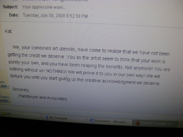 I was sitting on my computer, obviously checking my email, when I happened upon this horrible message. I had no idea that the tools of my trade felt so shunned. Of course I don't sign their names or give them credit on every single piece of my work, but I thought that went without saying. Of course I need them. Of course I know how much they do for me. How could they think that of me? And then I saw the signature...none other than...