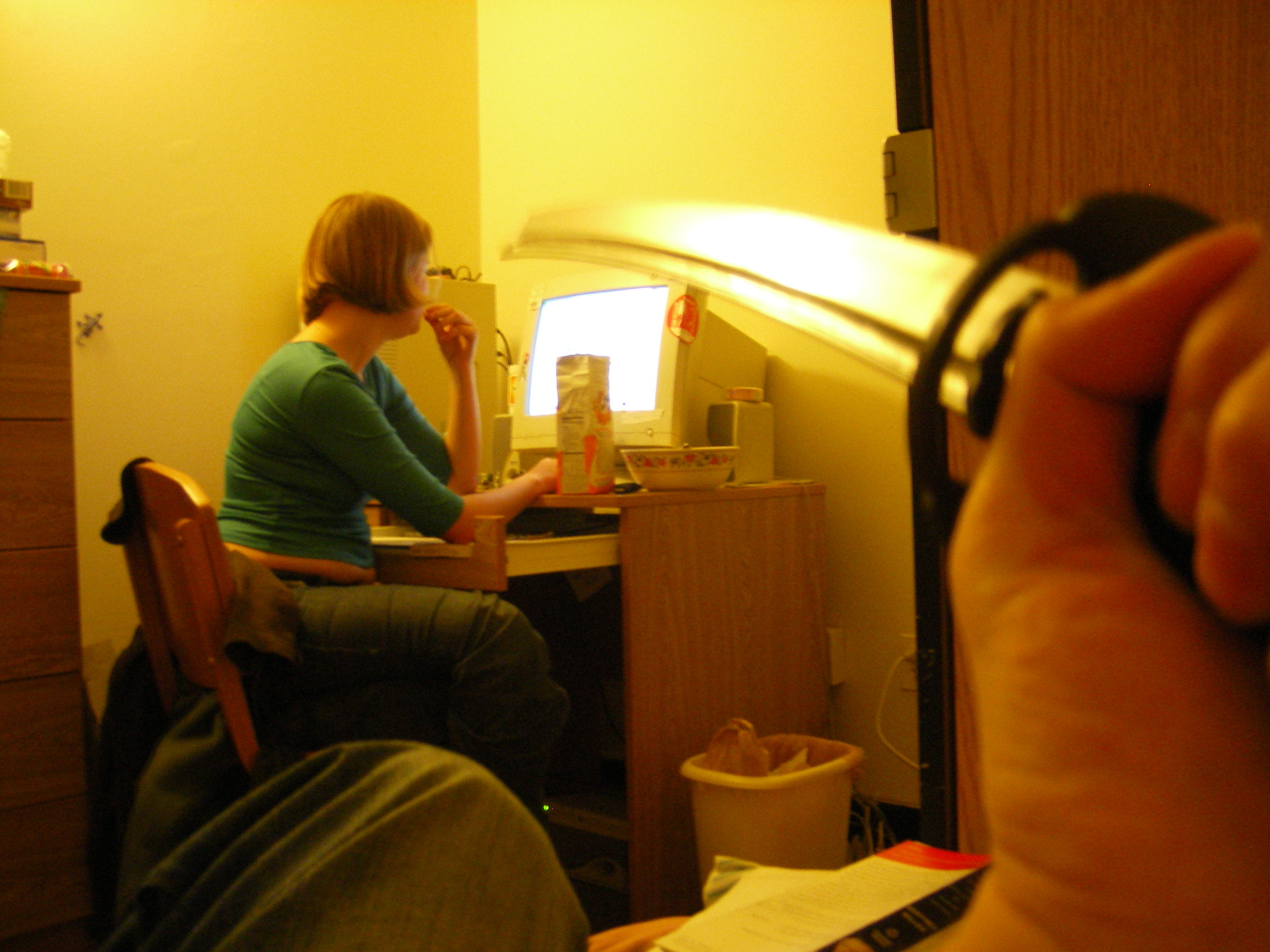 I call this picture, "Hello, little robot!" And yeah, it's been over a year since I lived in that dorm room, but oh well. I still like my all important pink post-it notes all over the wall.