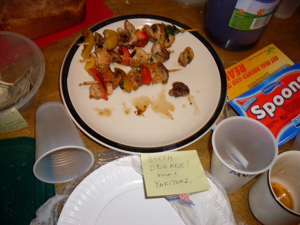 Spidere says: "A fine conclusion. Presentation is always a plus, and the skewers held delicious meats and vegetables. Baby portabello mushrooms are clearly the answer to humanity's ills. The soy flavor is strong and compelling, accentuating rather than detracting from the natural flavors of the ingredients. Definitely dinner, and a fine one at that."