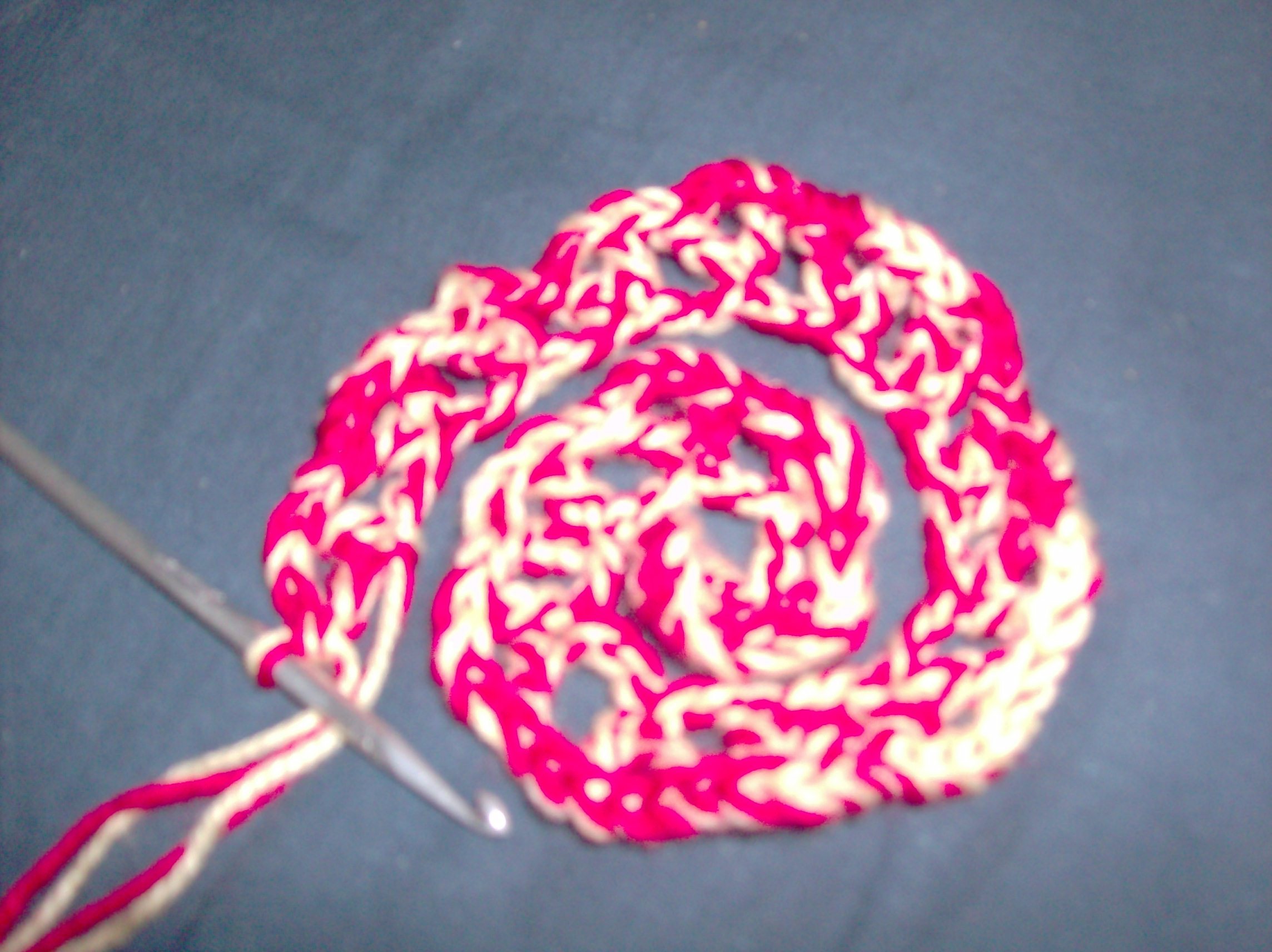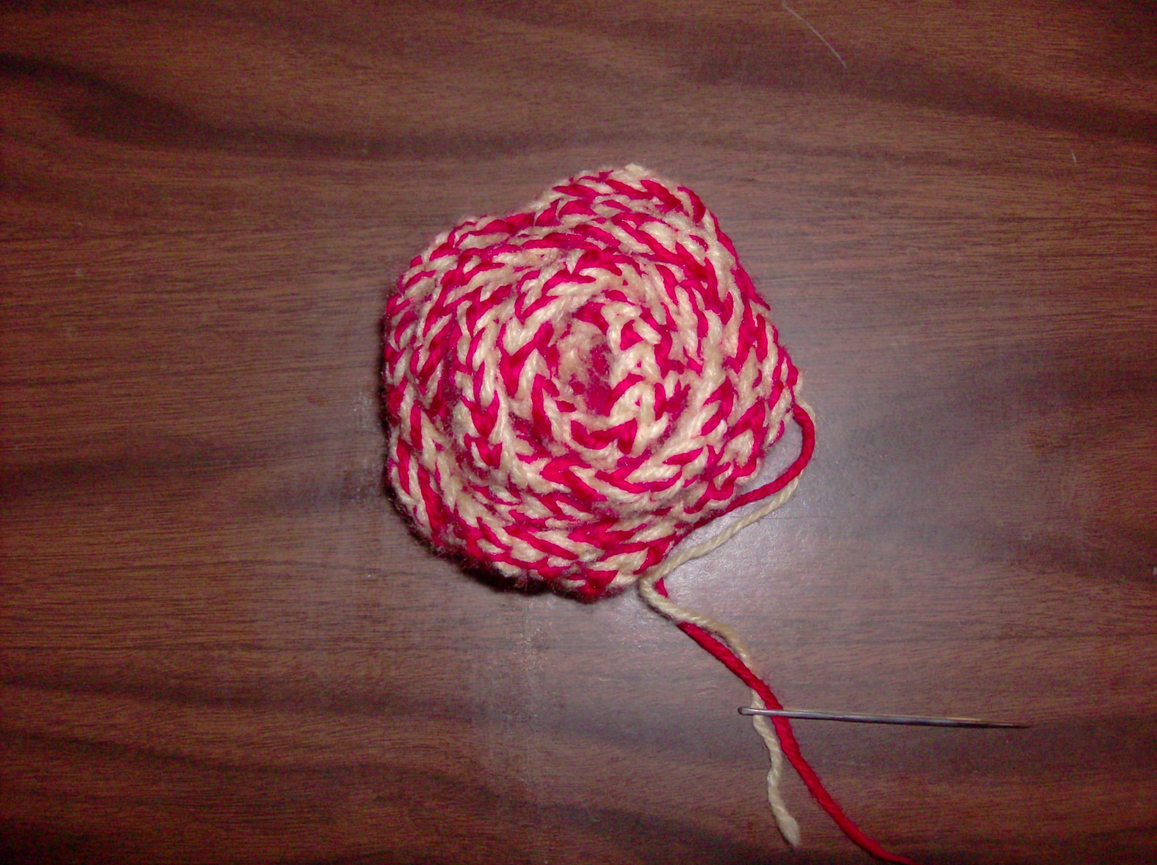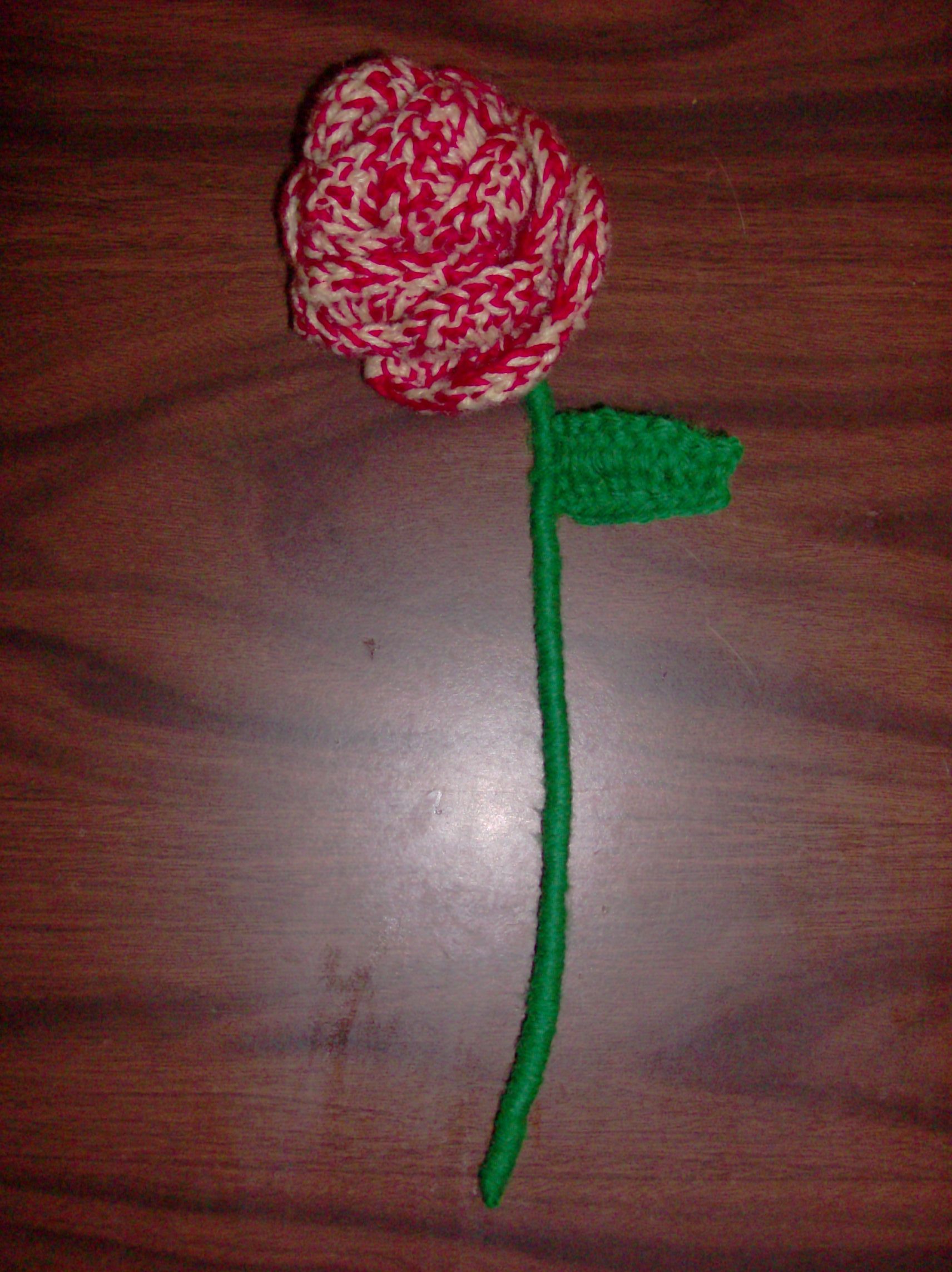 I wanted to crochet something to give to my boyfriend to tell him that I loved him. My first thought was to make him a heart, but wasn't sure if that was quite right for him. As I was thinking about it, I recalled telling him that I was going to get him flowers when he moved into his new apartment. So I says to myself "Self, you could crochet him a rose". After all, roses are a good expression of love. I went hunting through my yarn until I found a nice shade of red I liked. I also found a nice yellow. So I says to myself "Self, you should use yellow and red together, since red roses stand for love and yellow for friendship". And myself responses "Self, that's a fine idea."