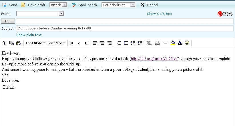 After finishing it, I tried to decide the best way to get it to him, seeing as I'm a poor college student and to cheap to actually mail it. I was just going to sneak in to him apartment and leave it but found the task Leave Clues, and you'll just have to look at that one for the rest.