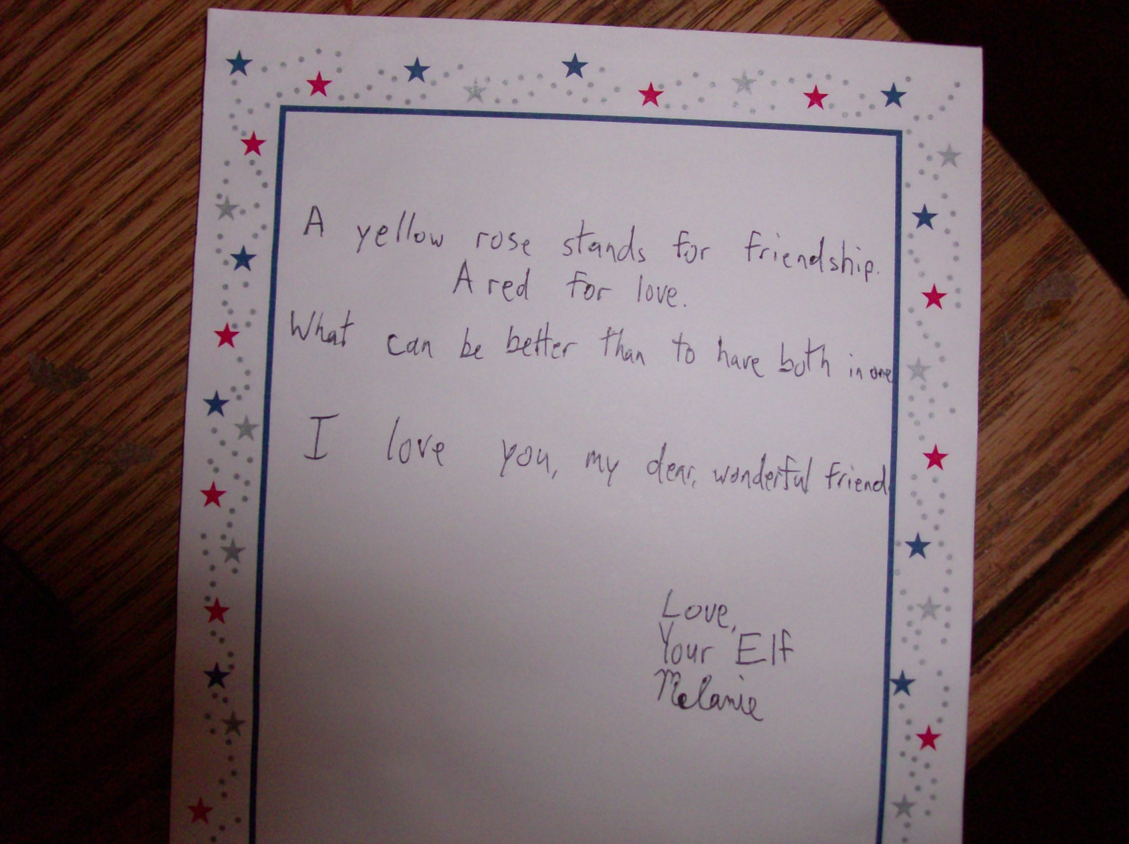 The letter I put next to the rose. "A yellow rose stands for friendship. A red for love. What can be better than to have both in one I love you my dear, wonderful friend Love, Your Elf Melanie"