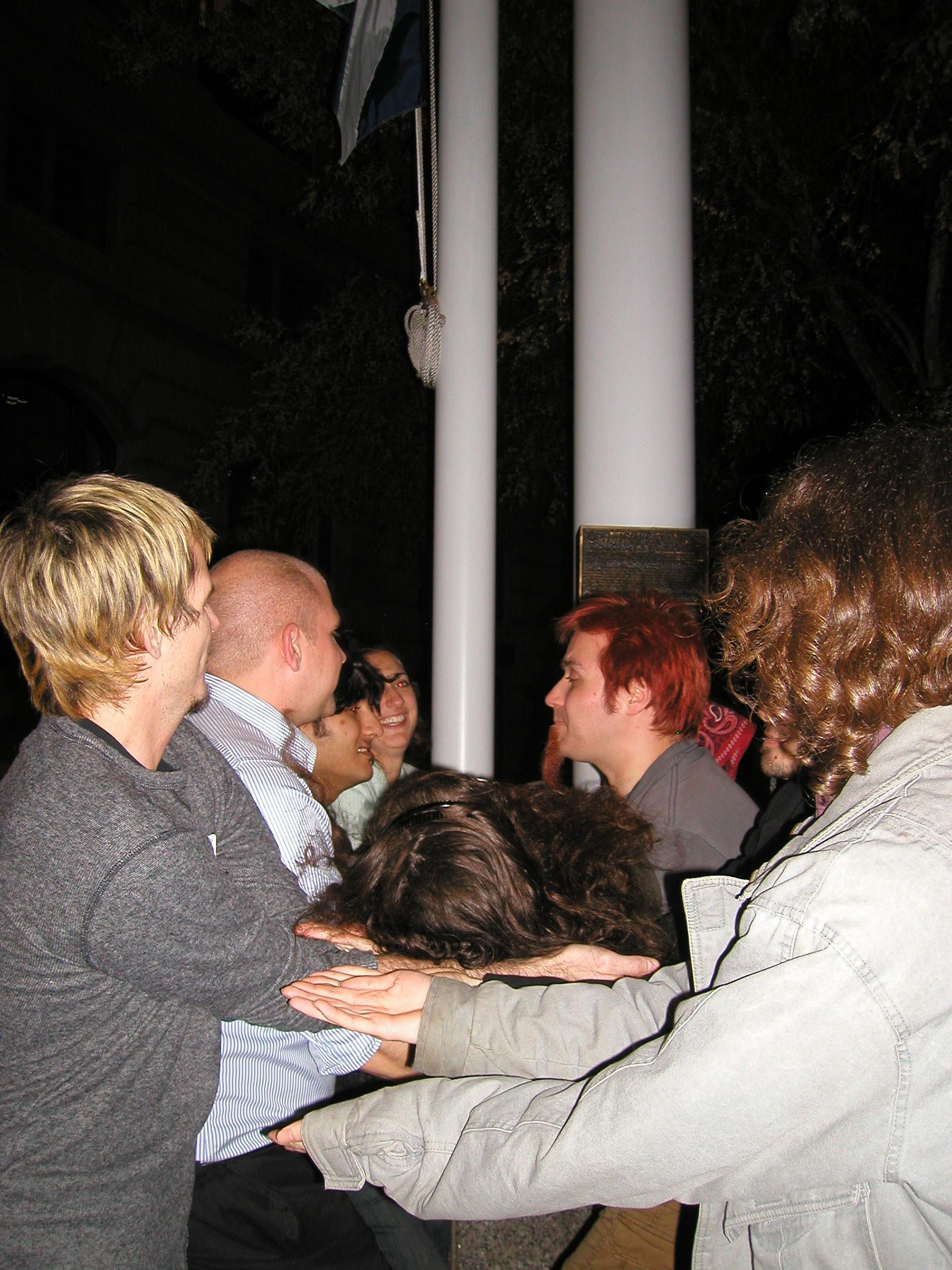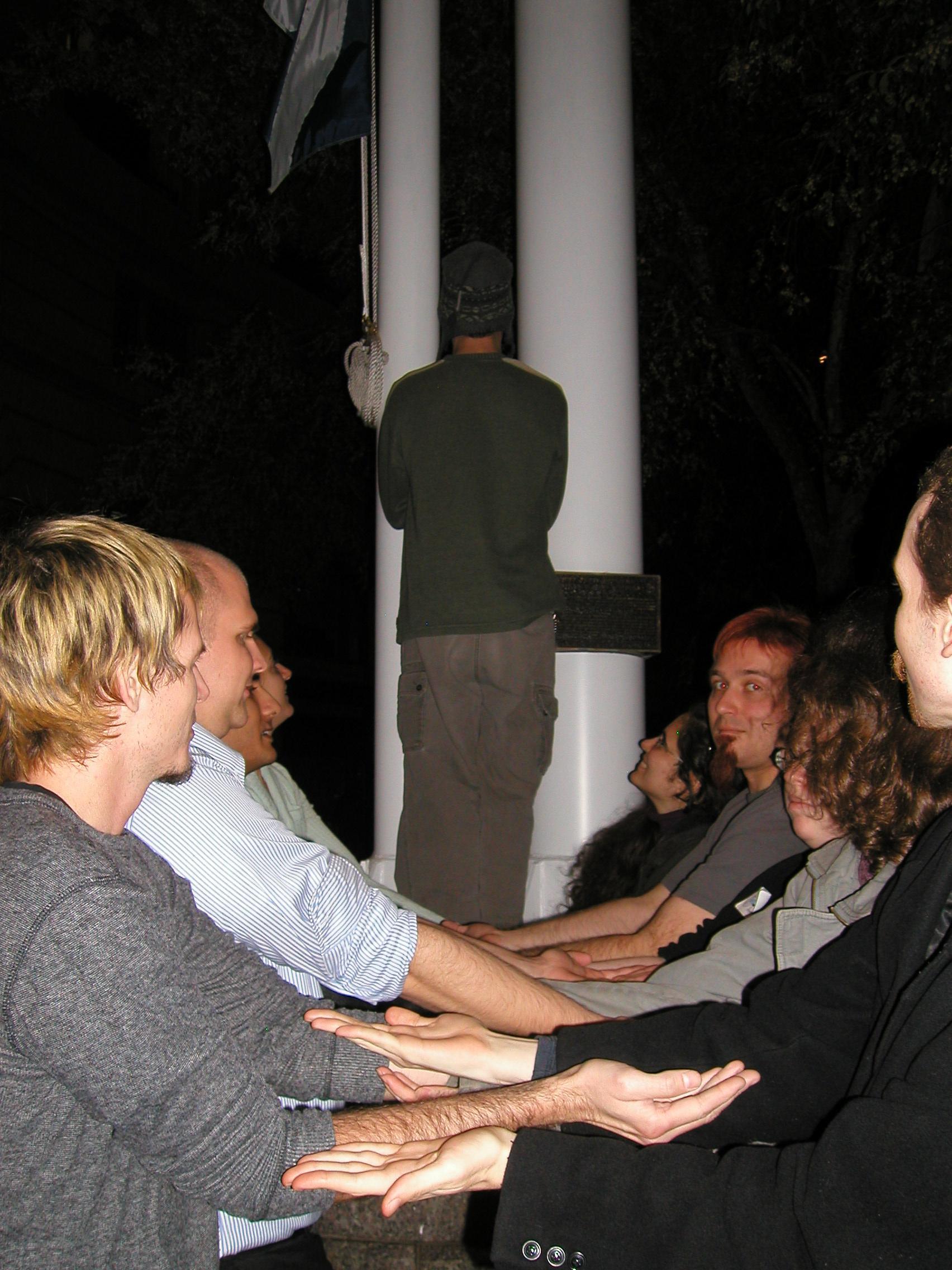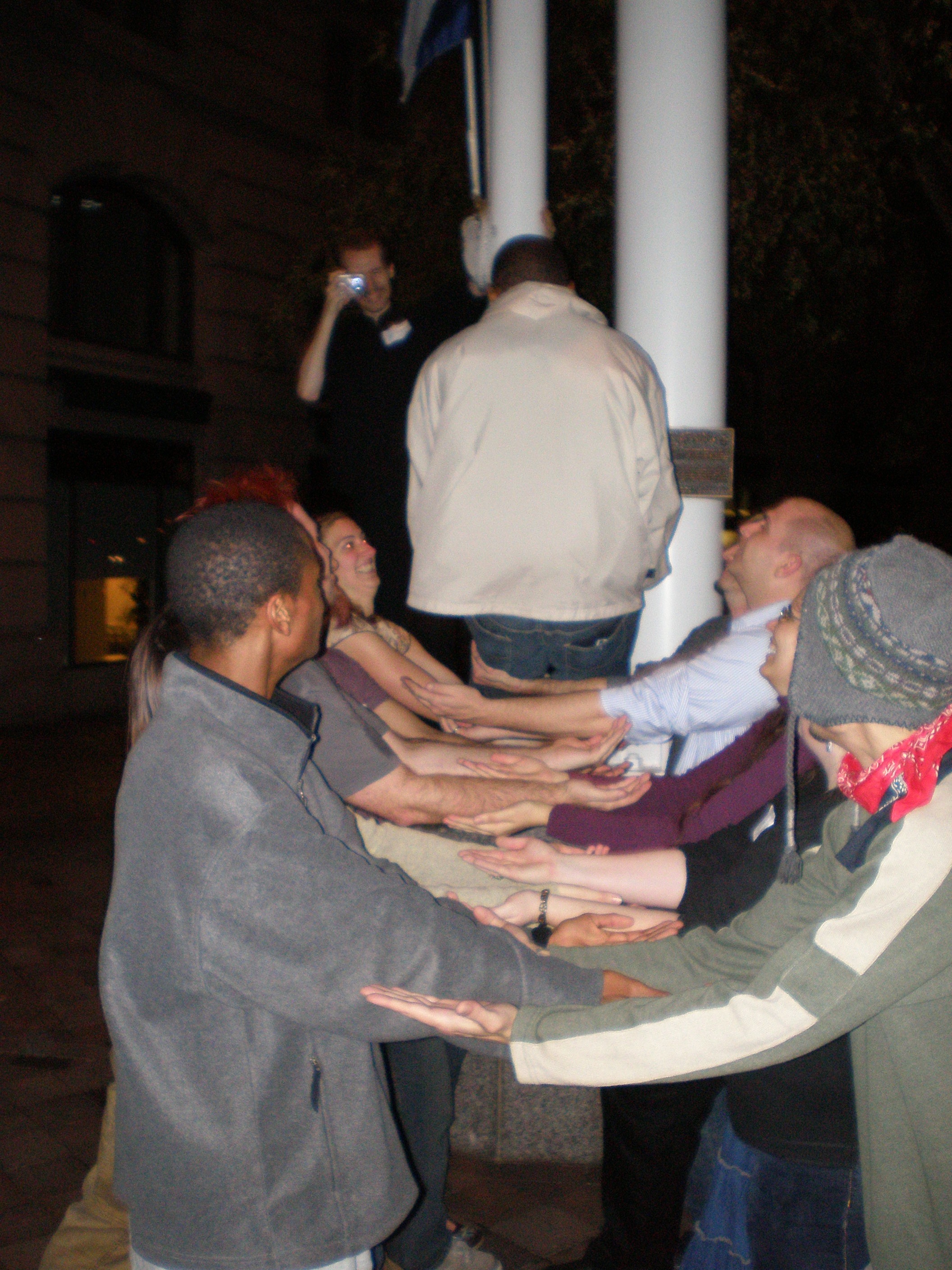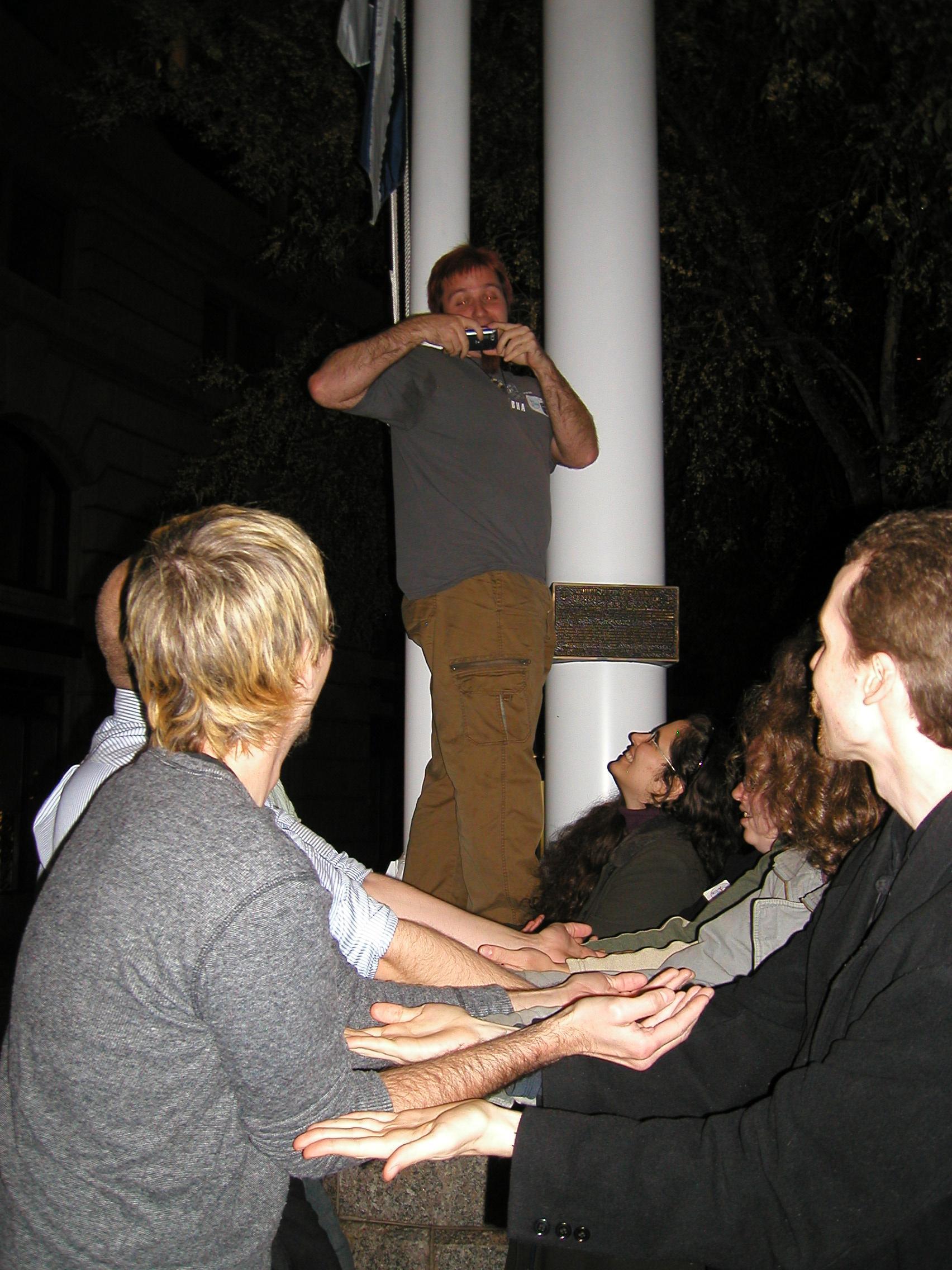 I can be somewhat paranoid about the safety of others. But trust exercises are all about using the strength of a group to safely perform otherwise frightening feats. I was thrilled. My excitement turned to horror quickly as we were preparing to do our first catch from the pillar and I realized the group had absolutely no idea what they were doing. Eep. A bit of tweaking and we at least looked ready, though my confidence level had dropped significantly. Talk about a learning curve, though! We had only met an hour previous, yet we worked as a seamless unit. Everyone large and small managed a practically perfect fall. Methinks I caught a glimpse of a future riddled with overwhelming tasks thwarted to pieces by the creativity and blind ambition of DC0. Oh - and possible jail time.