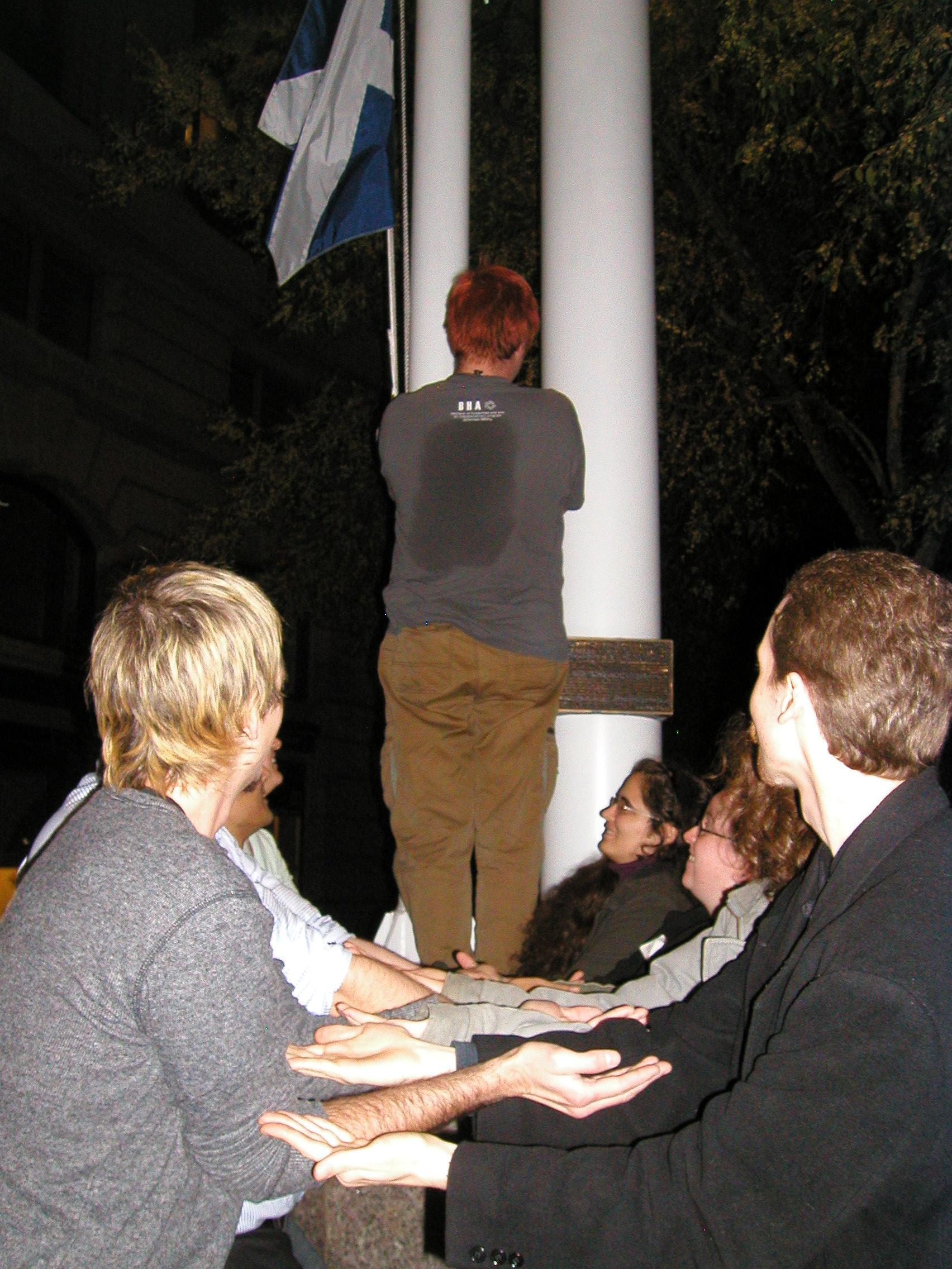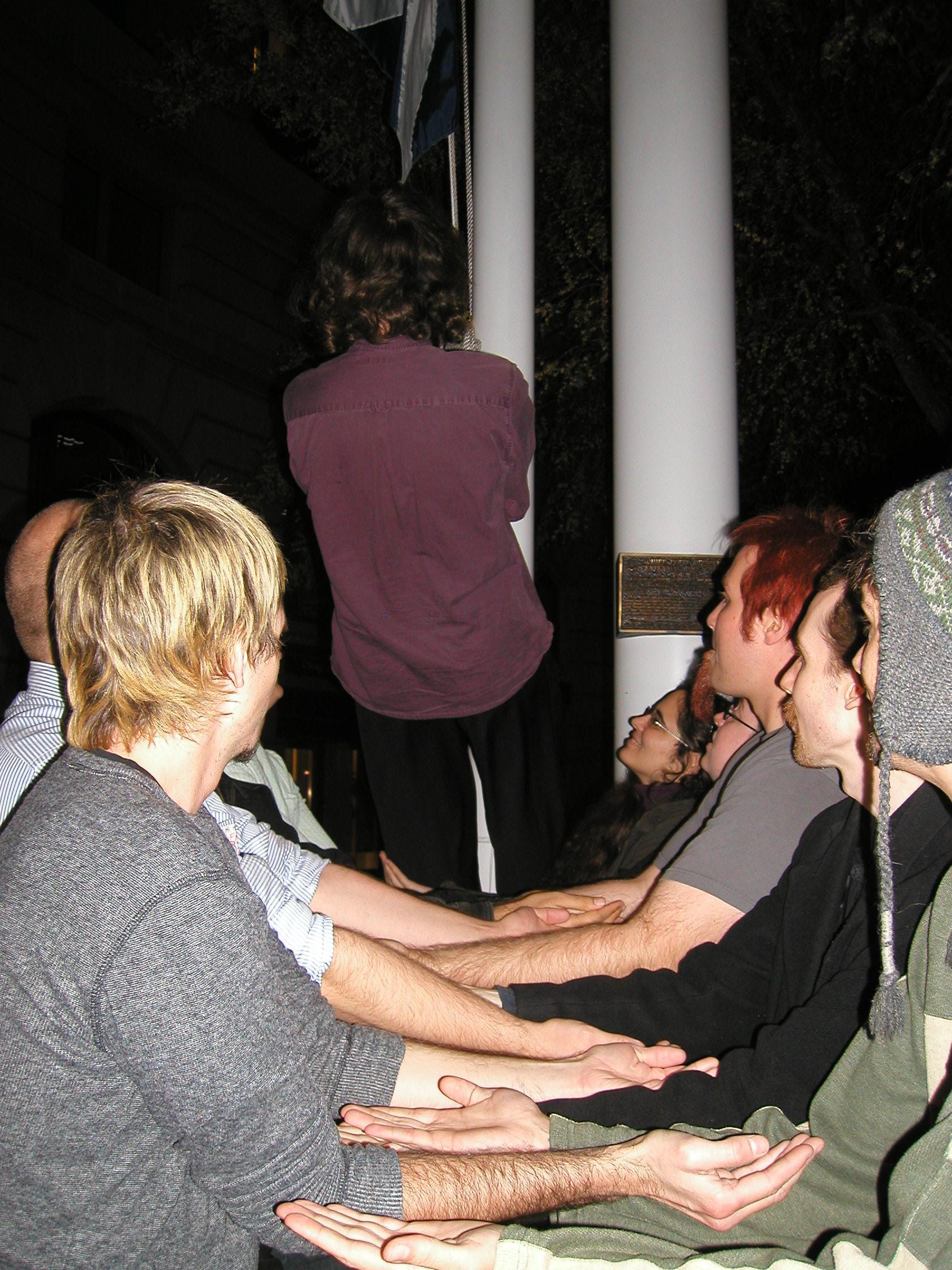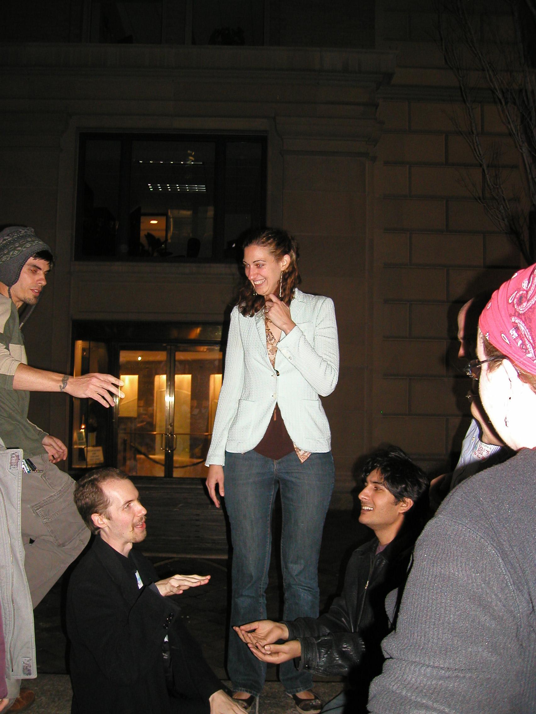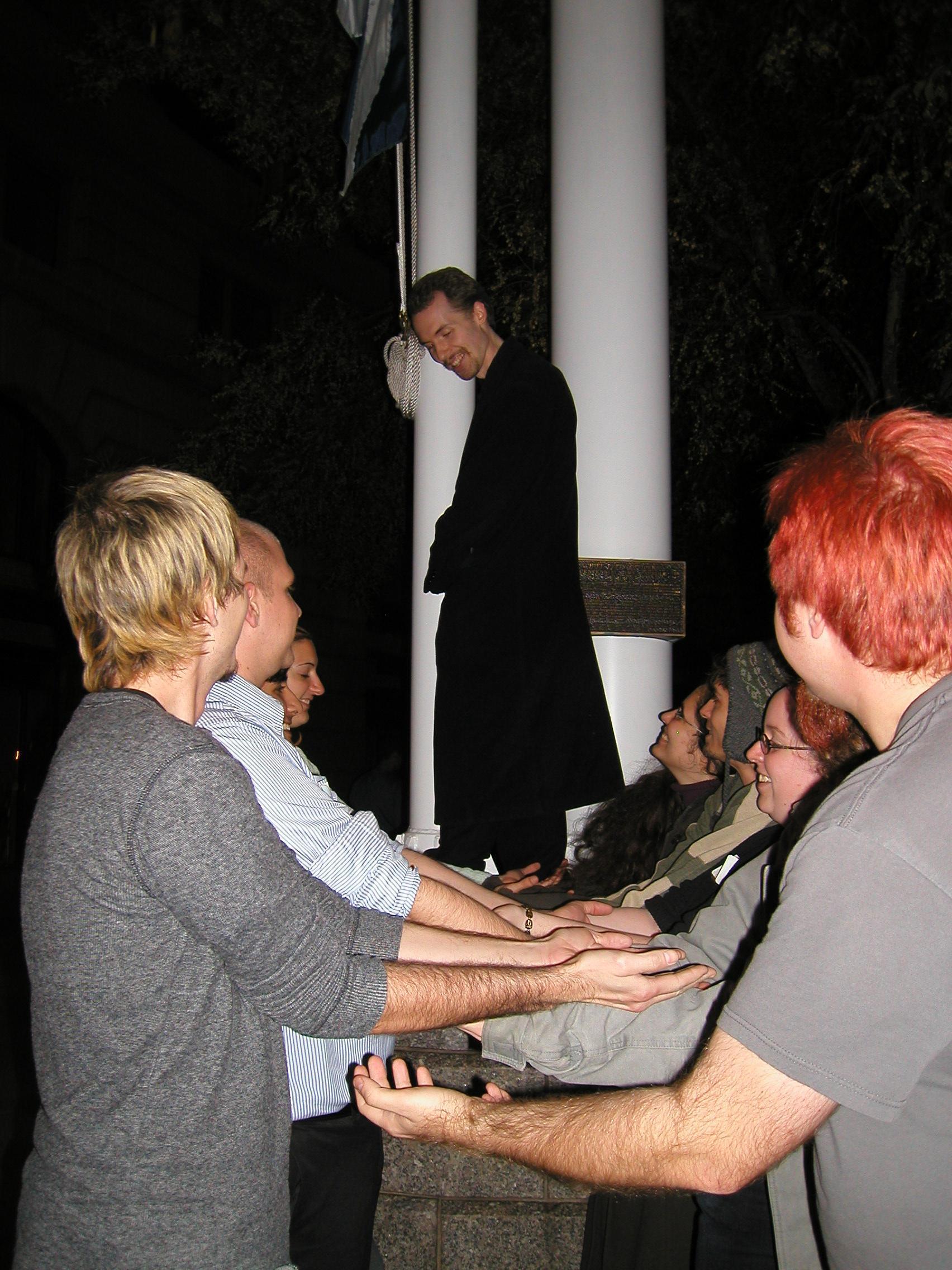I can be somewhat paranoid about the safety of others. But trust exercises are all about using the strength of a group to safely perform otherwise frightening feats. I was thrilled. My excitement turned to horror quickly as we were preparing to do our first catch from the pillar and I realized the group had absolutely no idea what they were doing. Eep. A bit of tweaking and we at least looked ready, though my confidence level had dropped significantly. Talk about a learning curve, though! We had only met an hour previous, yet we worked as a seamless unit. Everyone large and small managed a practically perfect fall. Methinks I caught a glimpse of a future riddled with overwhelming tasks thwarted to pieces by the creativity and blind ambition of DC0. Oh - and possible jail time.