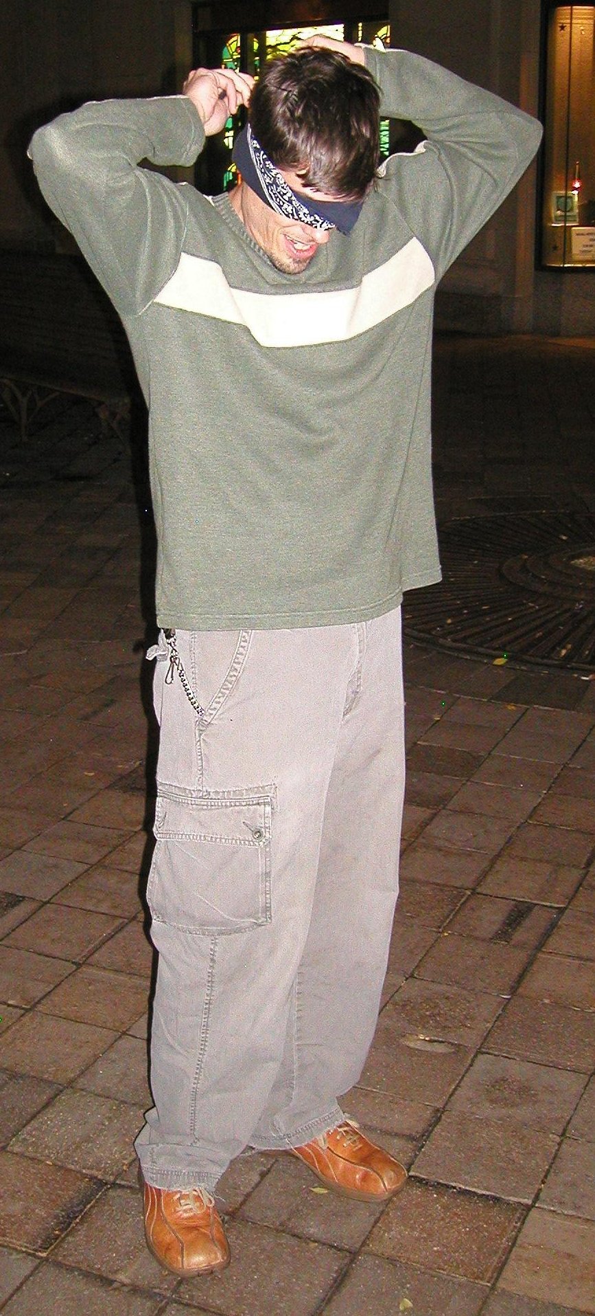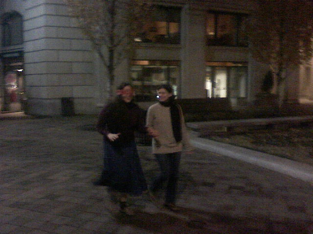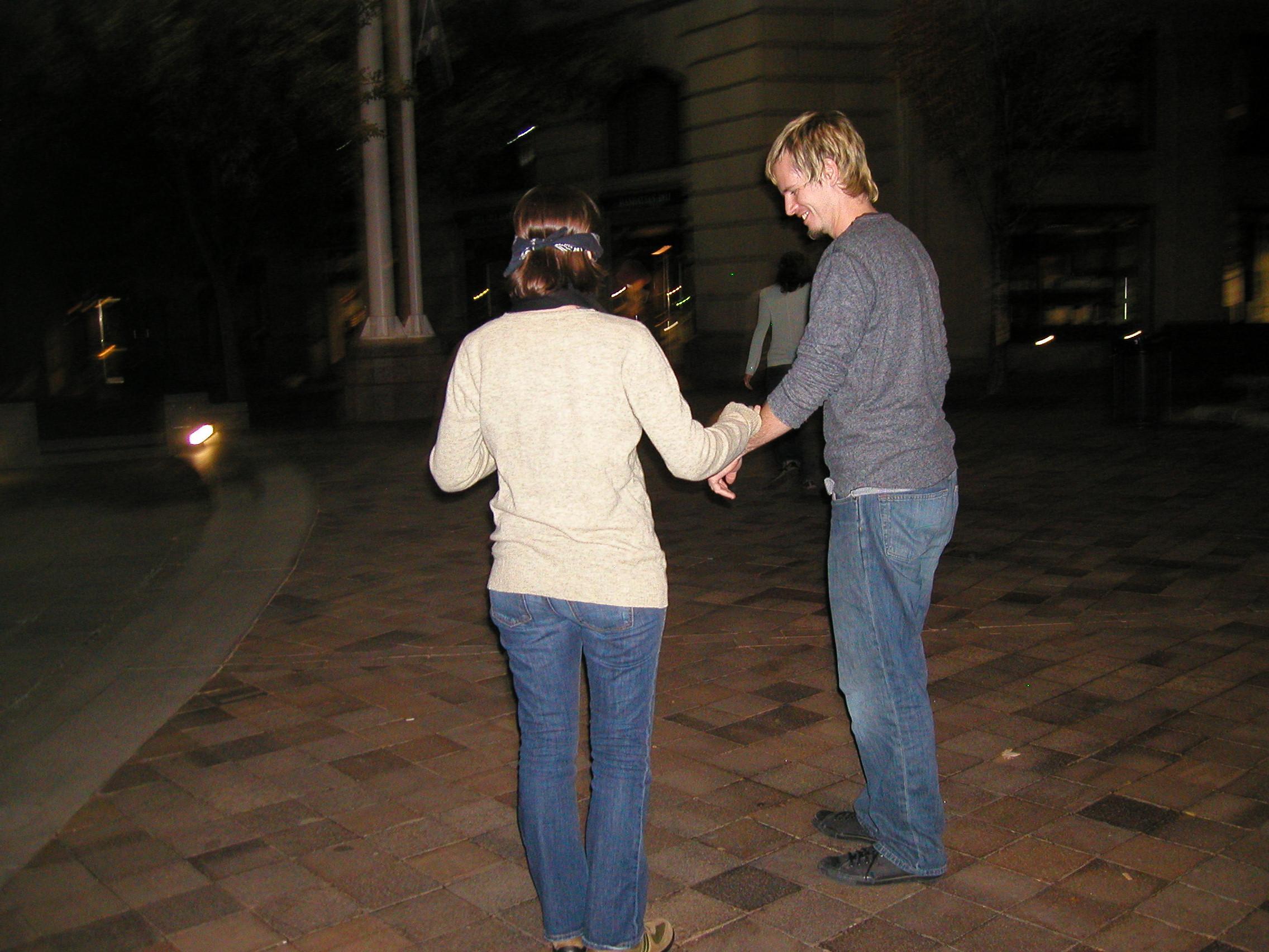 I rock climb a bit, so I'm used to falling -- even falling backwards -- without getting hurt. I'd thought that this would prepare me so that my heart wouldn't STOP for that suspended second. I guess the sympathetic nervous system knows the difference between a spongy mat and concrete, and a rope and nothing. But the landing was soft and proof that I could trust DC0 as well. It was harder to commit to a full run while blindfolded, even though I knew Kprime wouldn't let me crash into a concrete wall or a tree or anything -- I sort of kept my posture shifted back -- but there were a couple of brief moments when said nonconscious brain bits stopped worrying so much. By the time we got to the gauntlet, my trust was total and I wasn't worried at all about getting a palm to the nose (even though that did end up happening, but very very lightly). I tend to be an anxious person sometimes, and it's fantastic to experience a complete lack of anxiety. And fun to experience it with others.