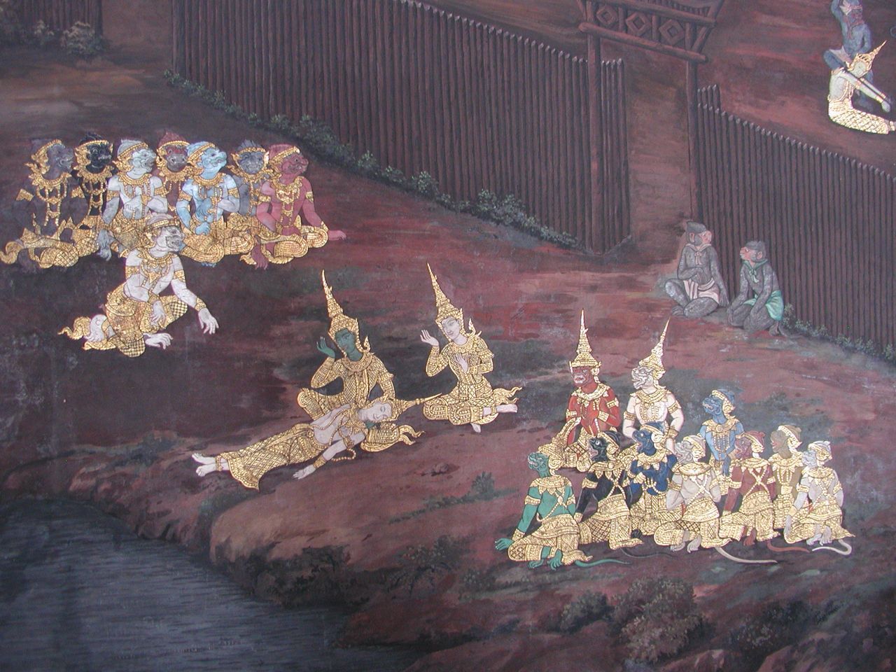 There are several layers of impermanence represented here. In a concrete, physical sense these paintings are impermanent, they have been restored, faded, fixed and so forth and are not the same as they were. Their meaning to Thais and to other viewers is also impermanent as, like any religion or culture, understanding tends to change with the times. Within the story the impermanence of our presence in the physical bodies is highlighted through the dead figure of Rama's wife Sita. However, as this is not really his wife but another being temporarily taking on the form of his wife as a trick it also harkens to the impermanence of our perception of the world. As with many of the tales I was told, the trick is figured out.