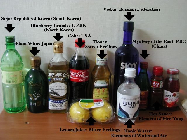 We brought back from the Joint Security Area of the DMZ blueberry brandy (called Paektusan and made in North Korea). A collection of beverages were acquired, each representing a nation or particular element relating to Korea [see chart below].