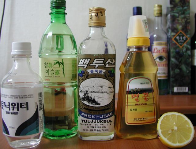 1/2 shot Paektusan 1/2 shot Soju Drop of honey Squeeze of lemon A shot or two of tonic Serve on ice