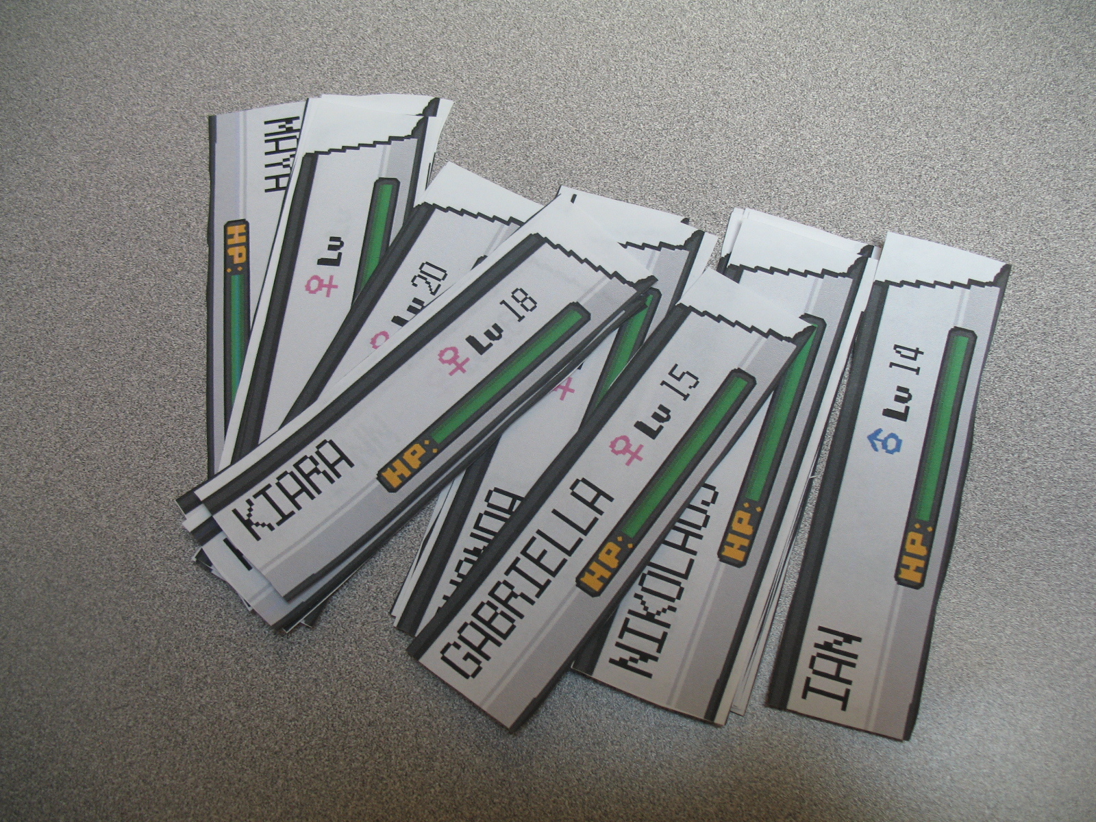Nemo and I decided to make things easier for the kids at my old high school anime club to battle each other by making Pokemon-based tags that displayed their species, level, and current amount of health. We made most of them ahead of time, but we had a few blank information displays in case there were any surprises.