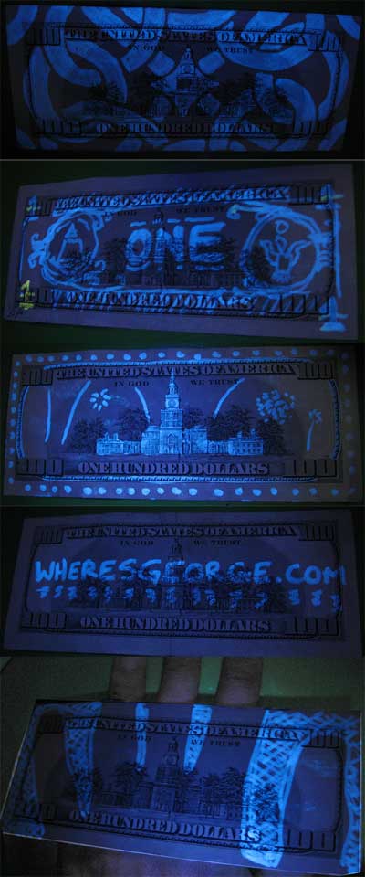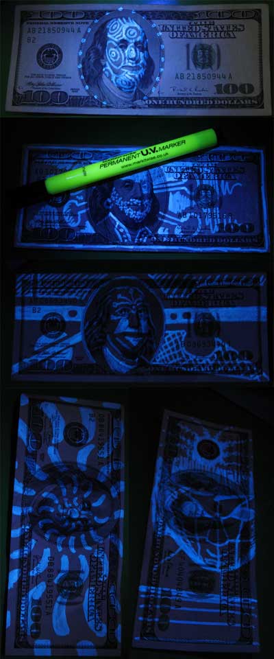 Instead, I decided to improve some bills with UV ink so that the bills look untouched to the naked eye, but are "enhanced" under black light.
