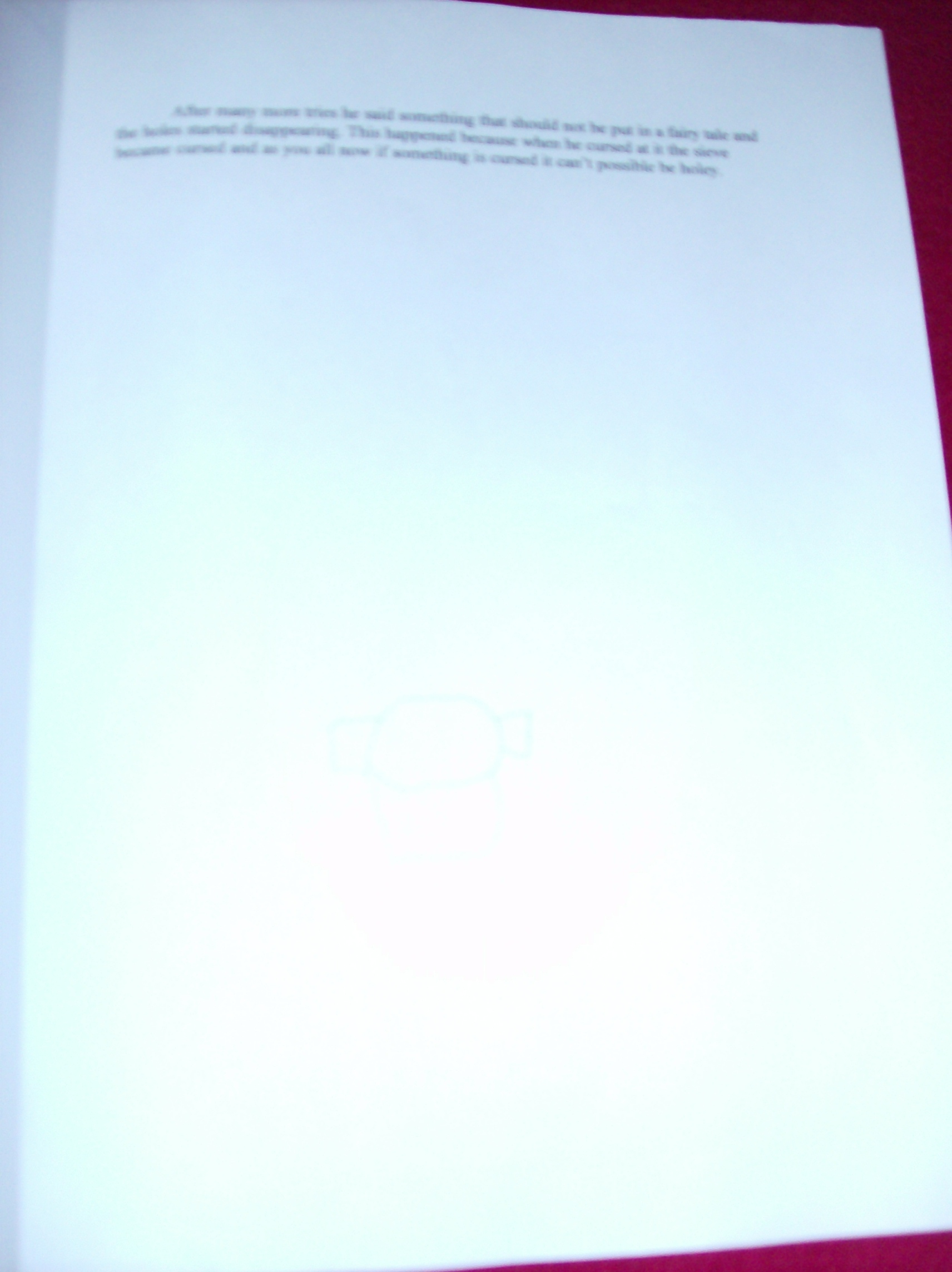 After many more tries he said something that should not be put in a fairy tale and the holes started disappearing. This happened because when he cursed at it the sieve became cursed and as you all now if something is cursed it can’t possible be holey.