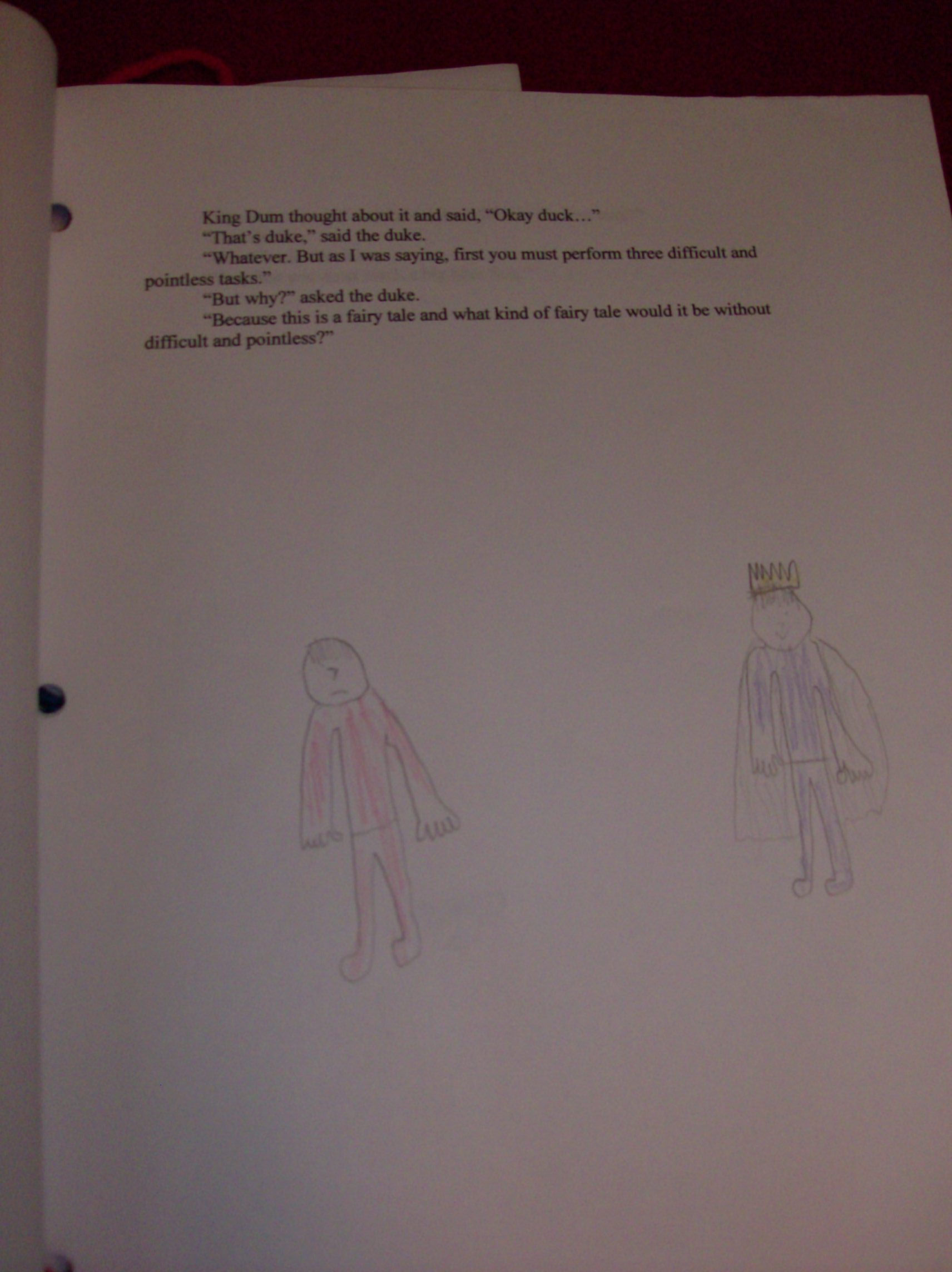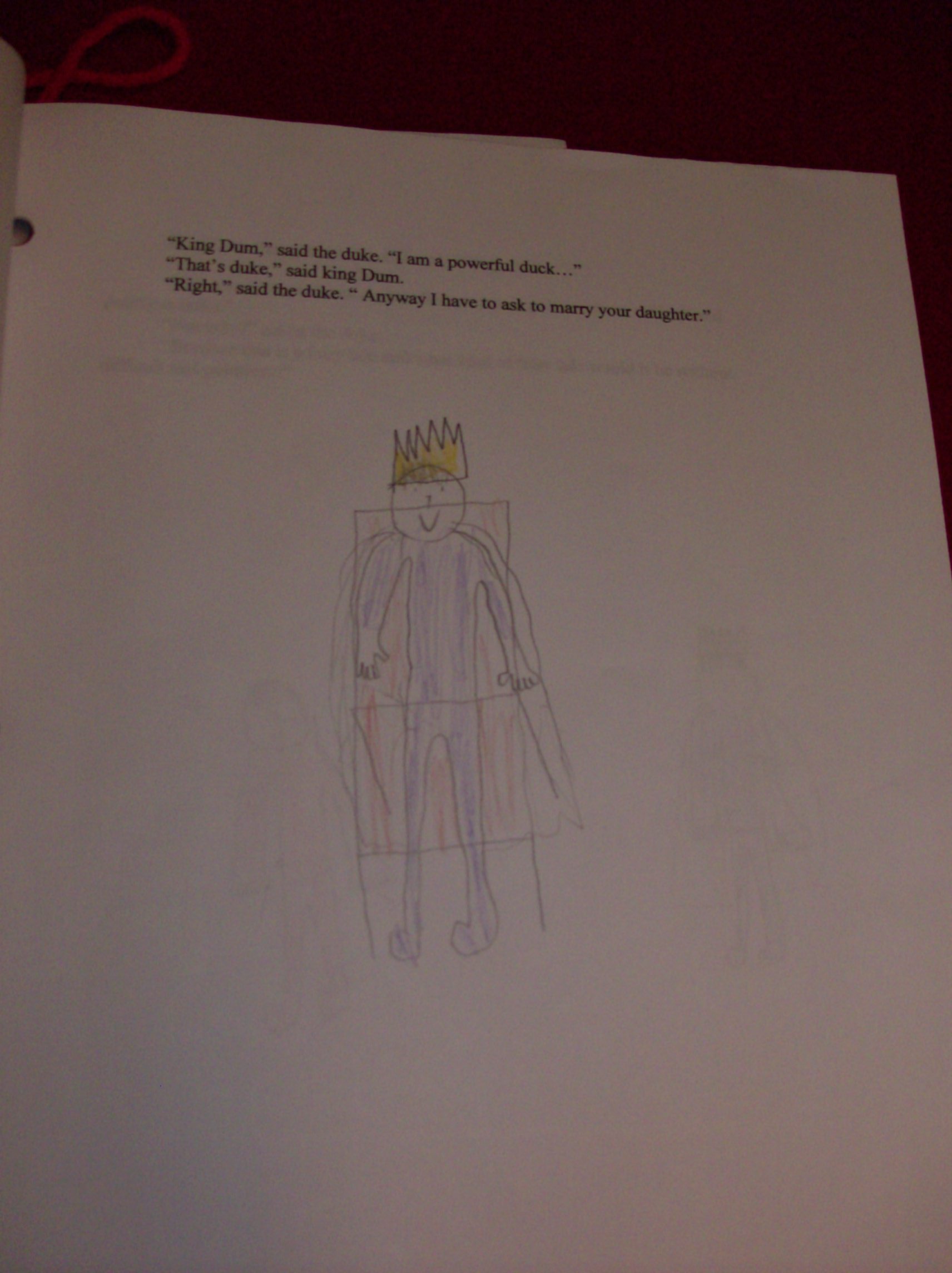 “King Dum,” said the duke. “I am a powerful duck…” “That’s duke,” said king Dum. “Right,” said the duke. “ Anyway I have to ask to marry your daughter.”