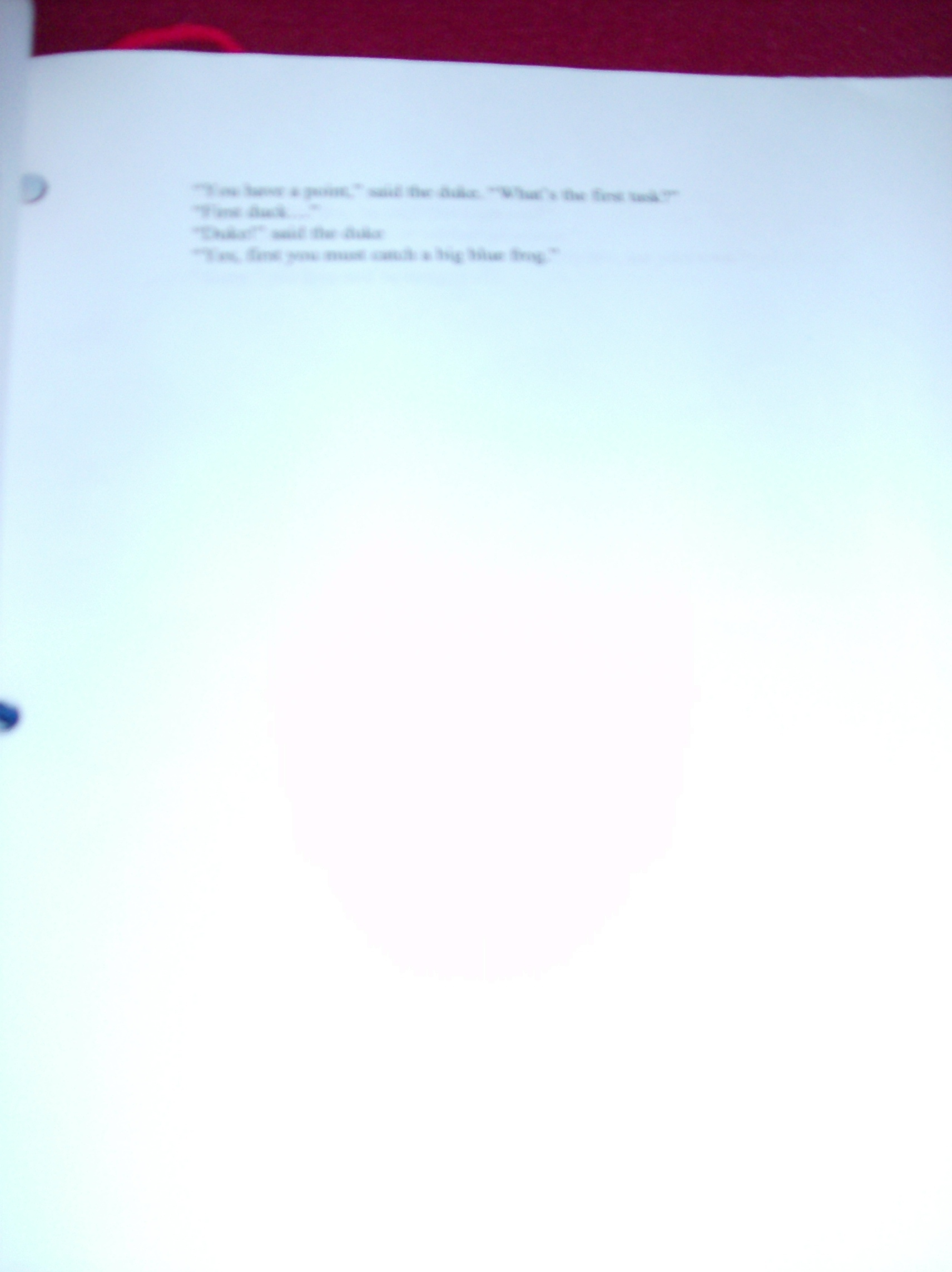 “You have a point,” said the duke. “What’s the first task?” “First duck…” “Duke!” said the duke “Yes, first you must catch a big blue frog.”