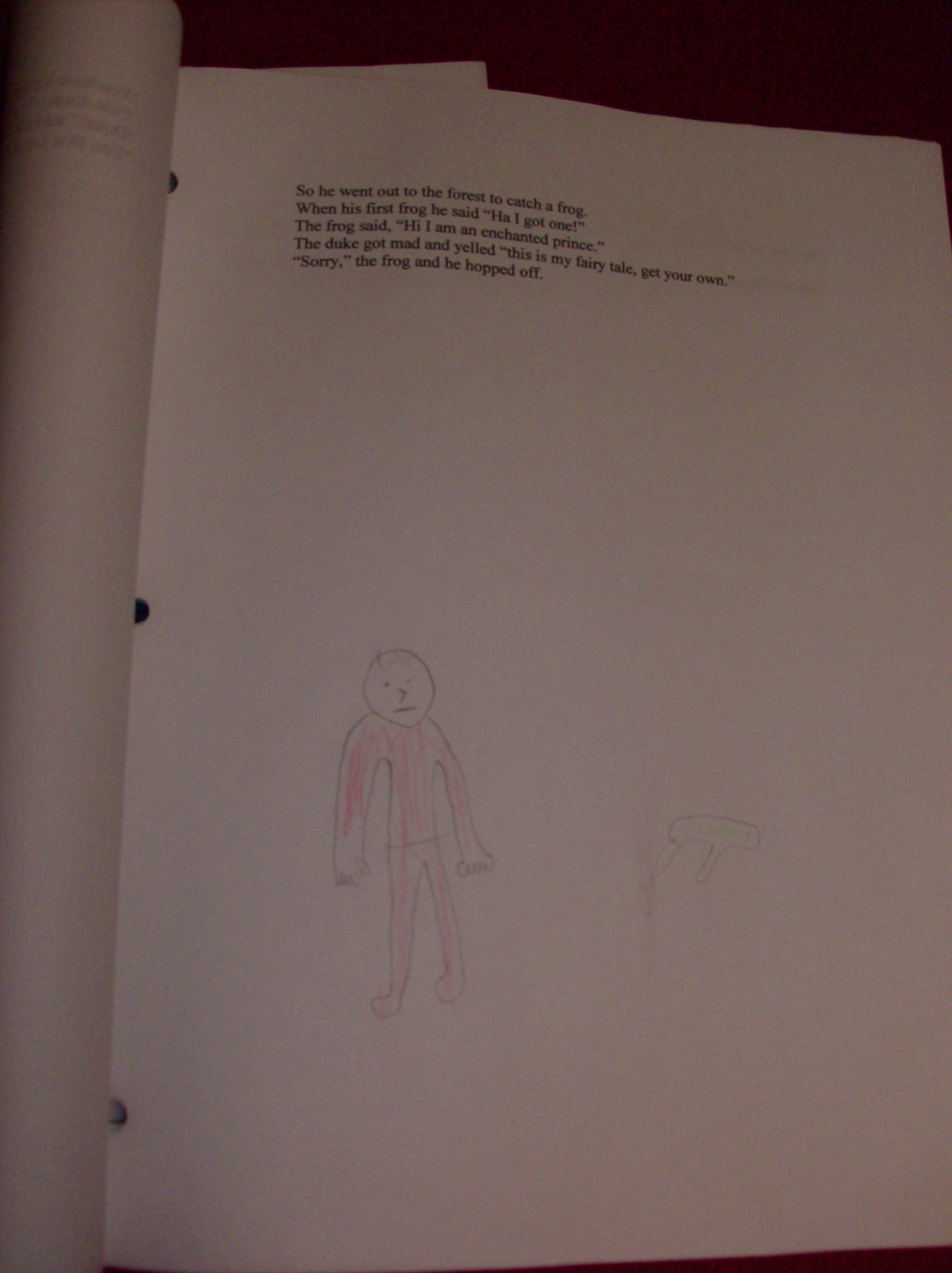 So he went out to the forest to catch a frog. When he caught his first frog he said “Ha I got one!” The frog said, “Hi I am an enchanted prince.” The duke got mad and yelled “this is my fairy tale, get your own.” “Sorry,” the frog said, and he hopped off.