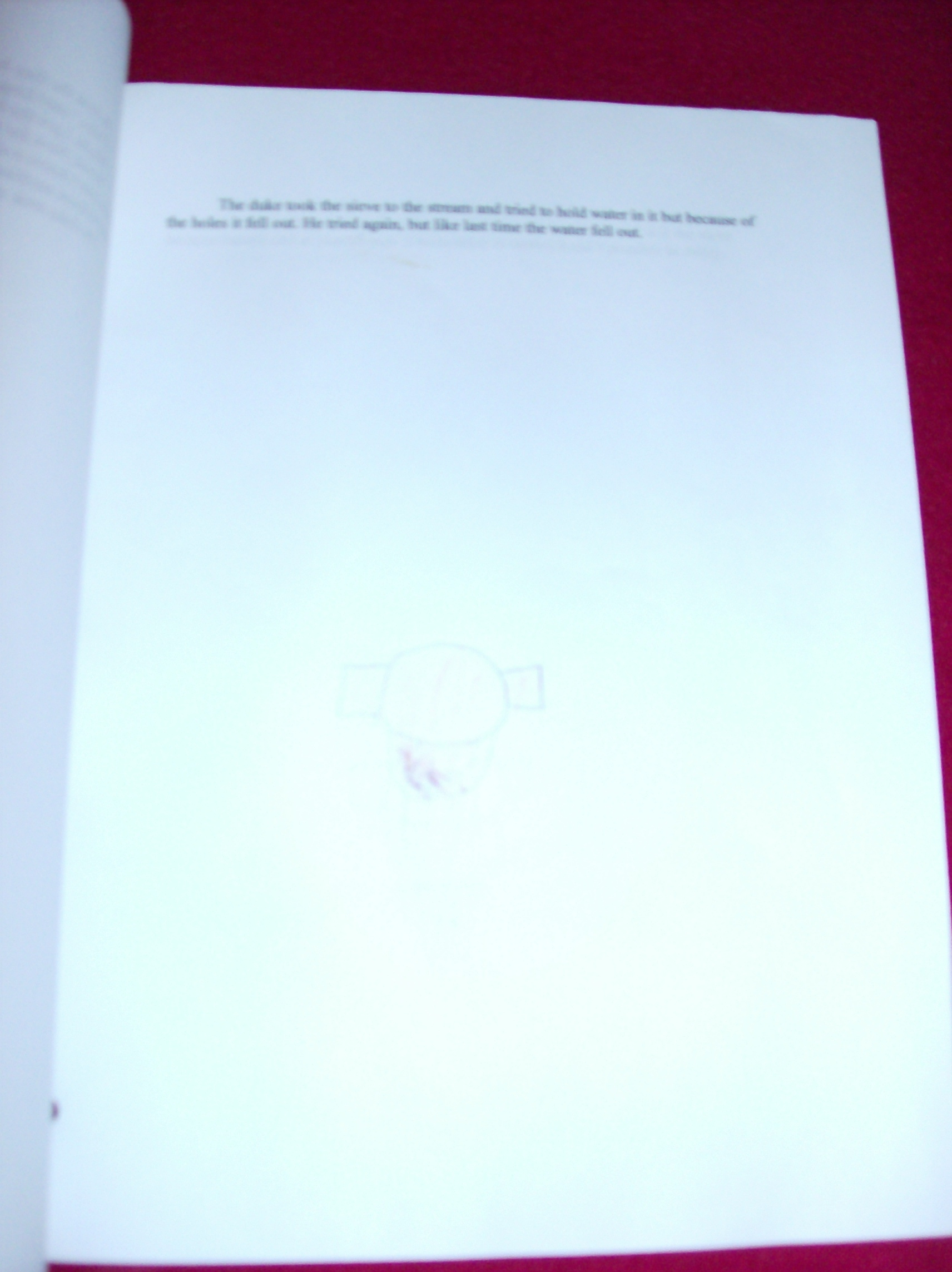 He took the frog back and said, “I the duck…” “Duke,” said king Dum. “Right, I got the blue frog.” “Good. Now for your second task you must carry water in a sieve.” For those of you who don’t know a sieve is, it is a container with holes in the bottom so water can go through without anything else going through. The duke took the sieve saying, “I will be back with the water soon.”