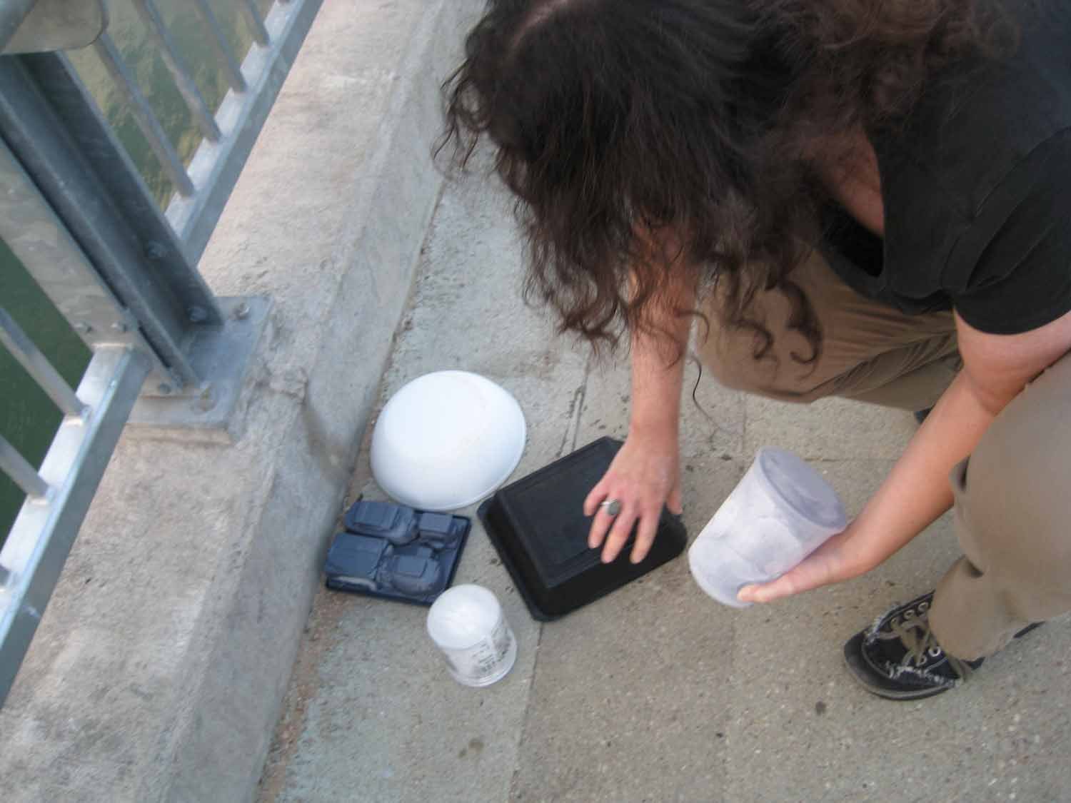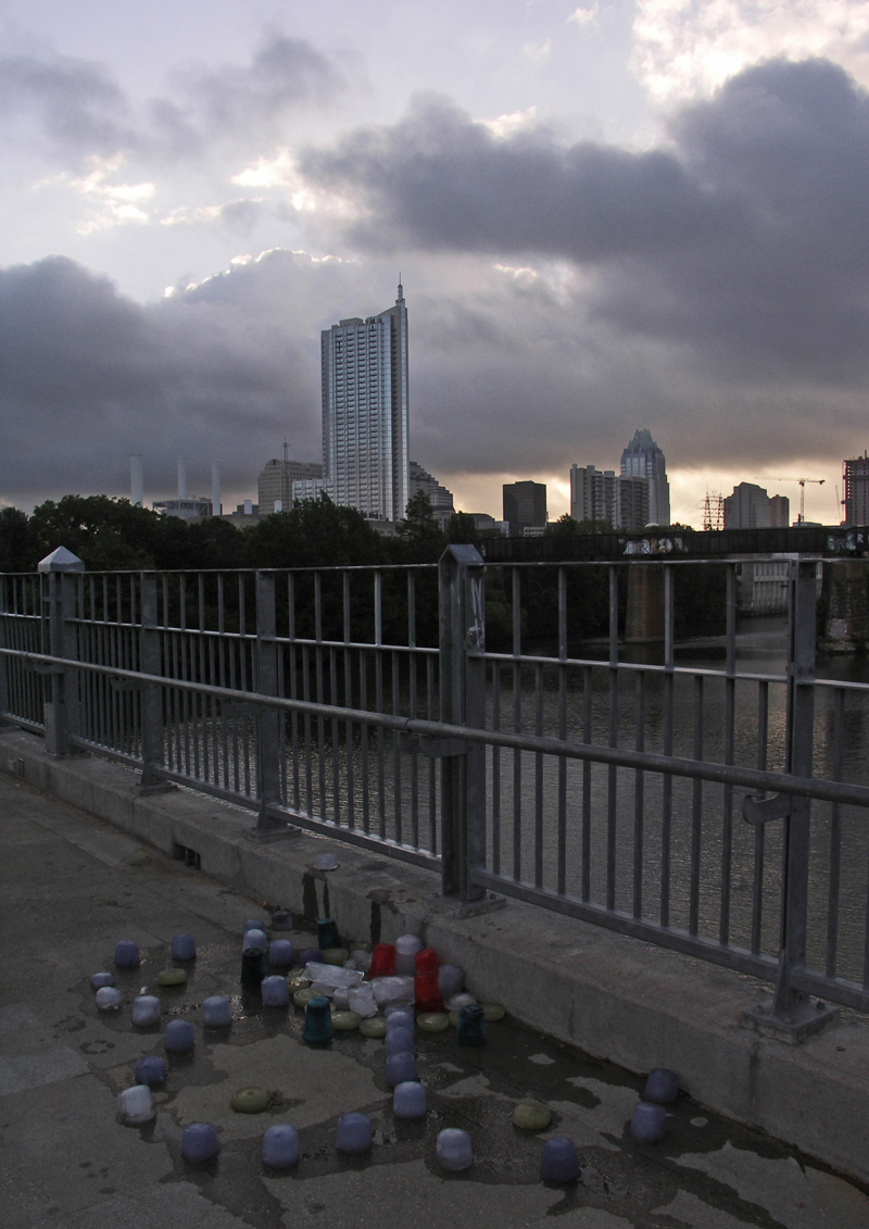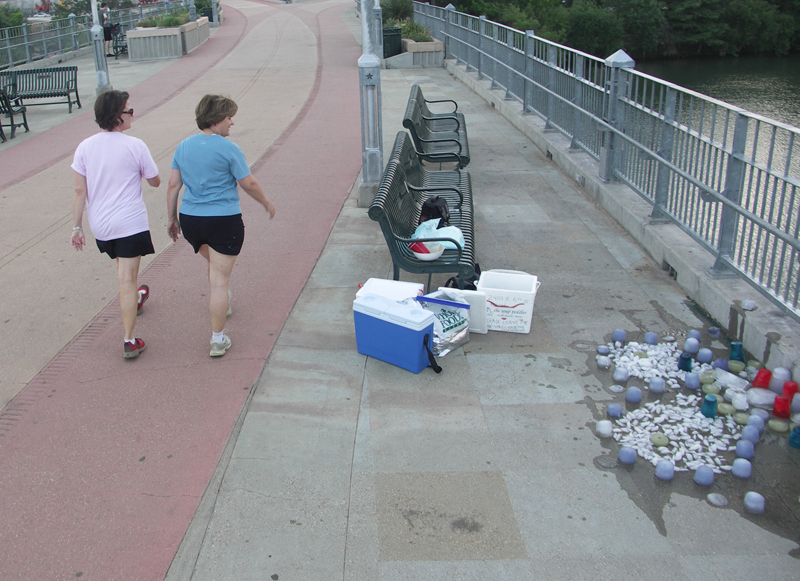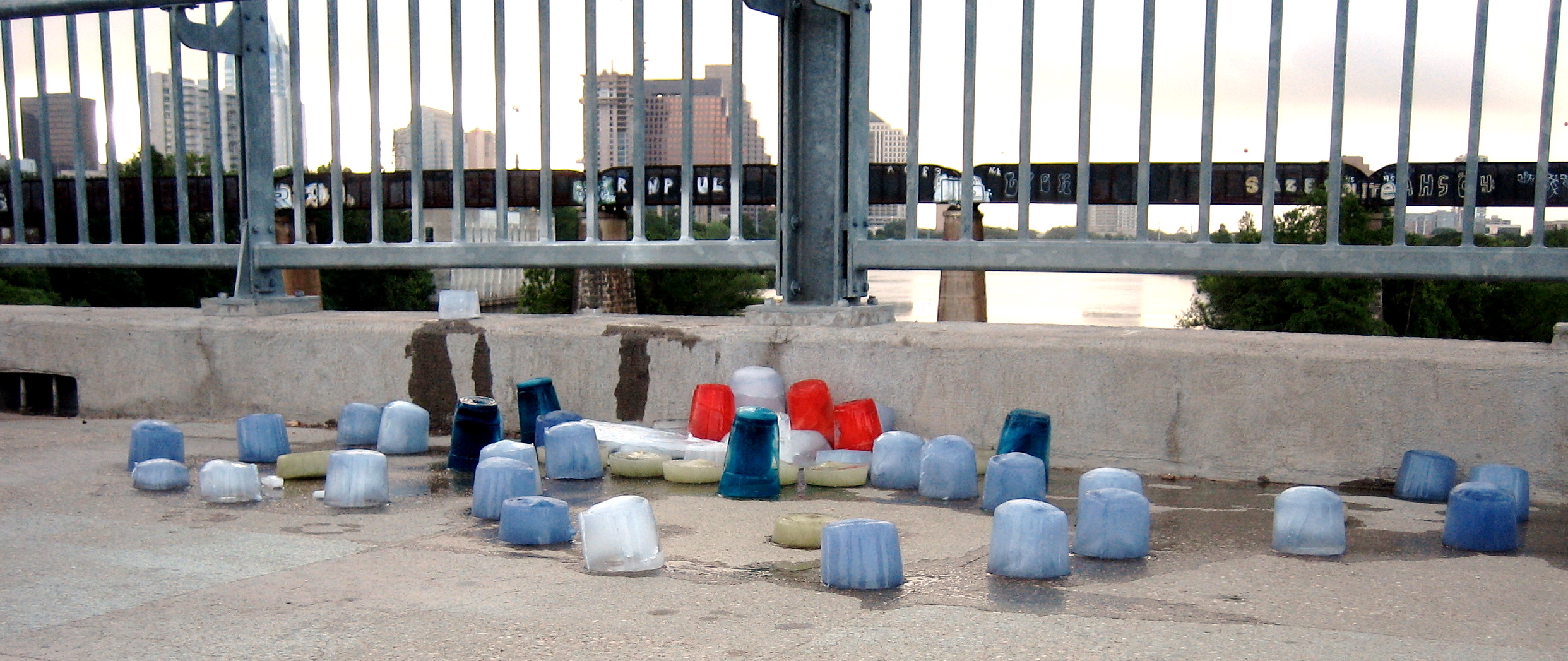 I didn't completely settle on the public space to decorate with our ice until the night before we were scheduled to rendezvous, when I realized that the Lamar Street Pedestrian Bridge was the perfect place, both aesthetically and locationally (we would have heavy coolers to haul).