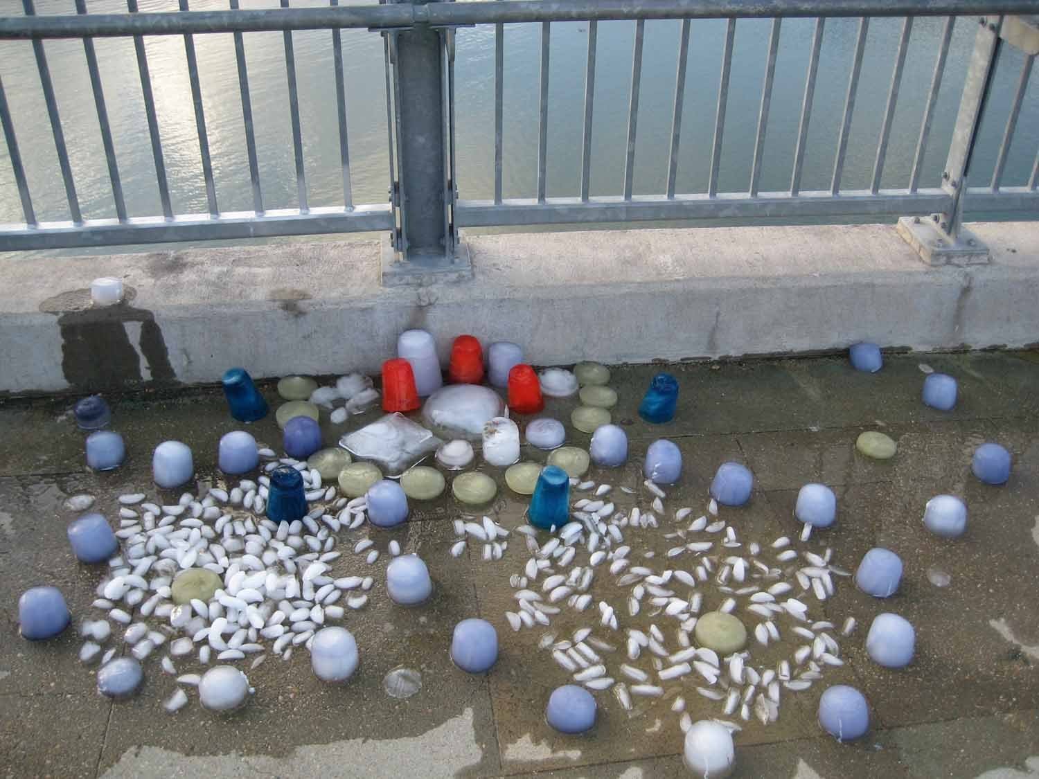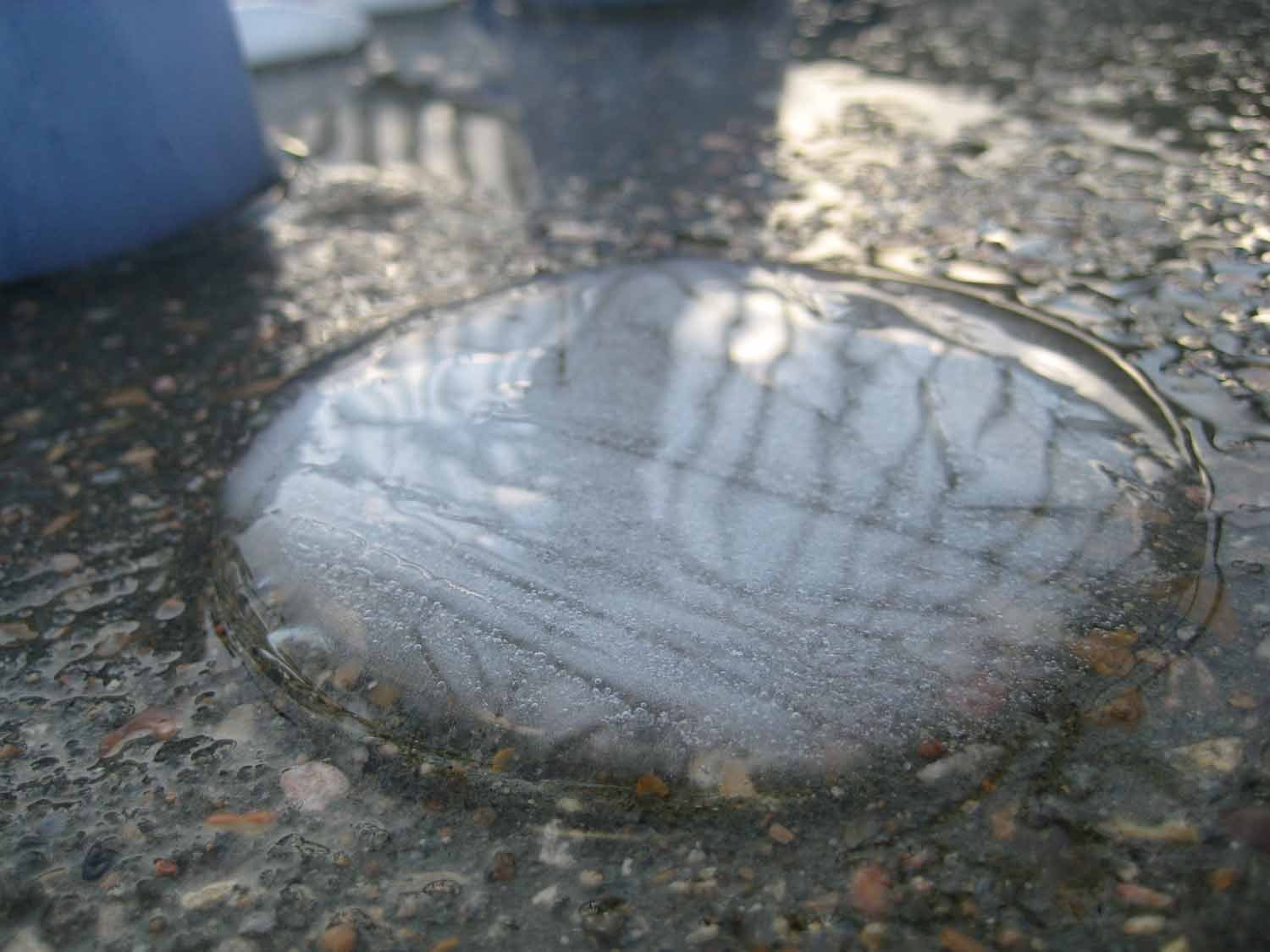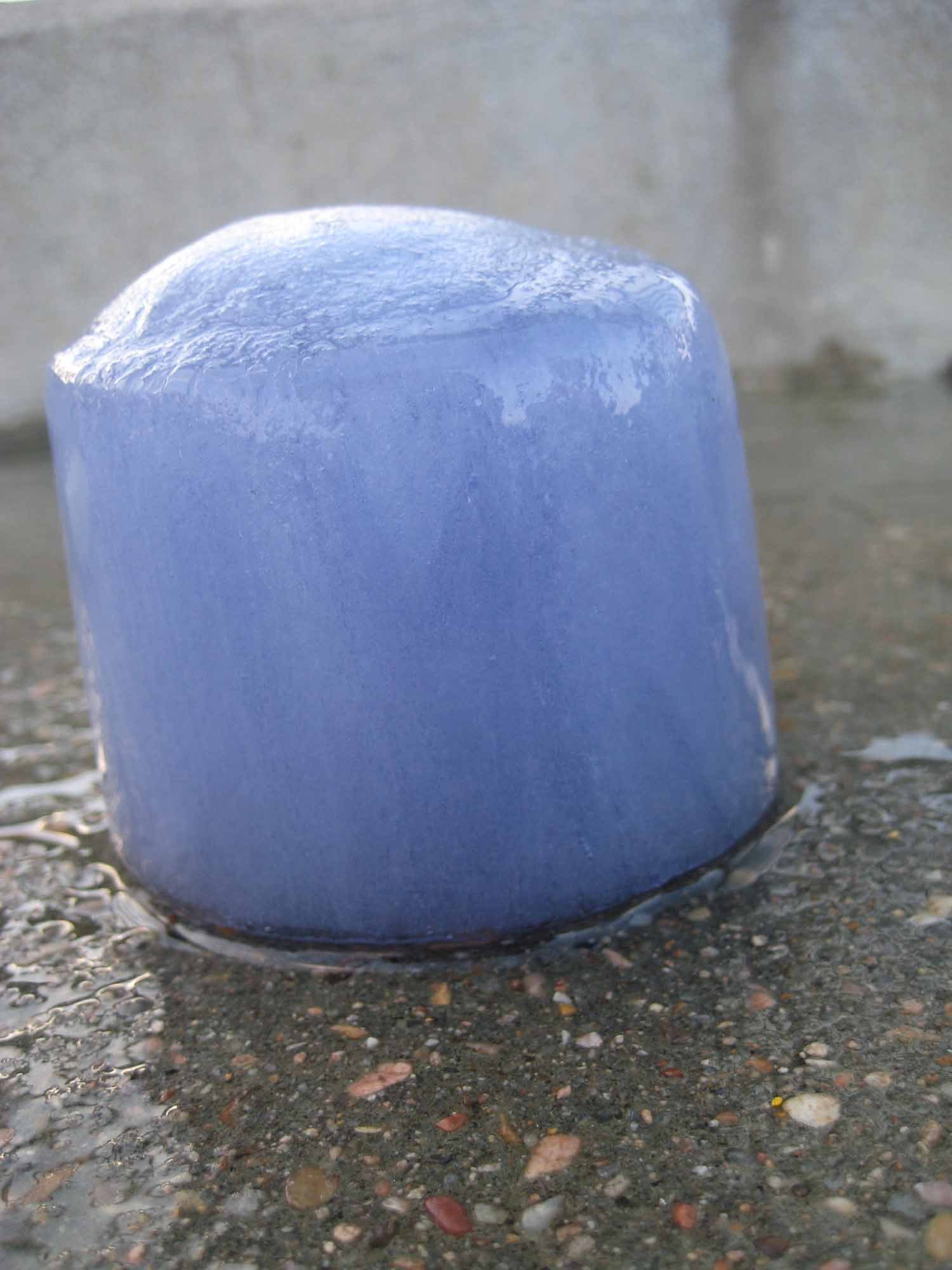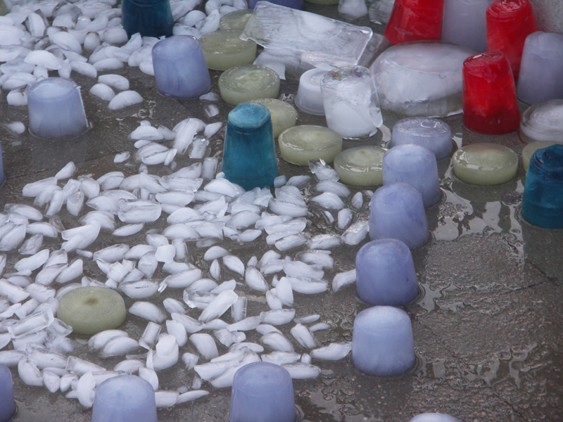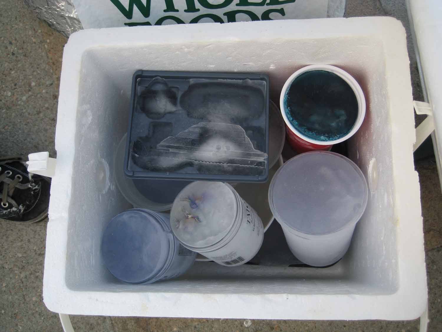 Evil Sugar and Sparrows Fall both came up with more uniform ideas for ice forms. I passed the blue stuff on to Sparrows Fall; Evil Sugar and the gummy bears cooked up another approach to coloring the ice (see below). We discussed locations and plans of attack while we each continued to make ice. (I added some more uniform shapes, too, in the form of large plastic cups.) We decided to do it early and settled on 7am, and, given the nature of the shapes we had, to do an ice mandala.