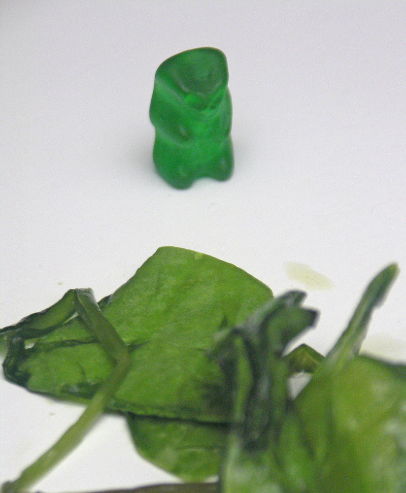 The gummies found some wilty spinach in the back of the Evil Human Overlord's fridge. They decided that it would make a good natural dye.
