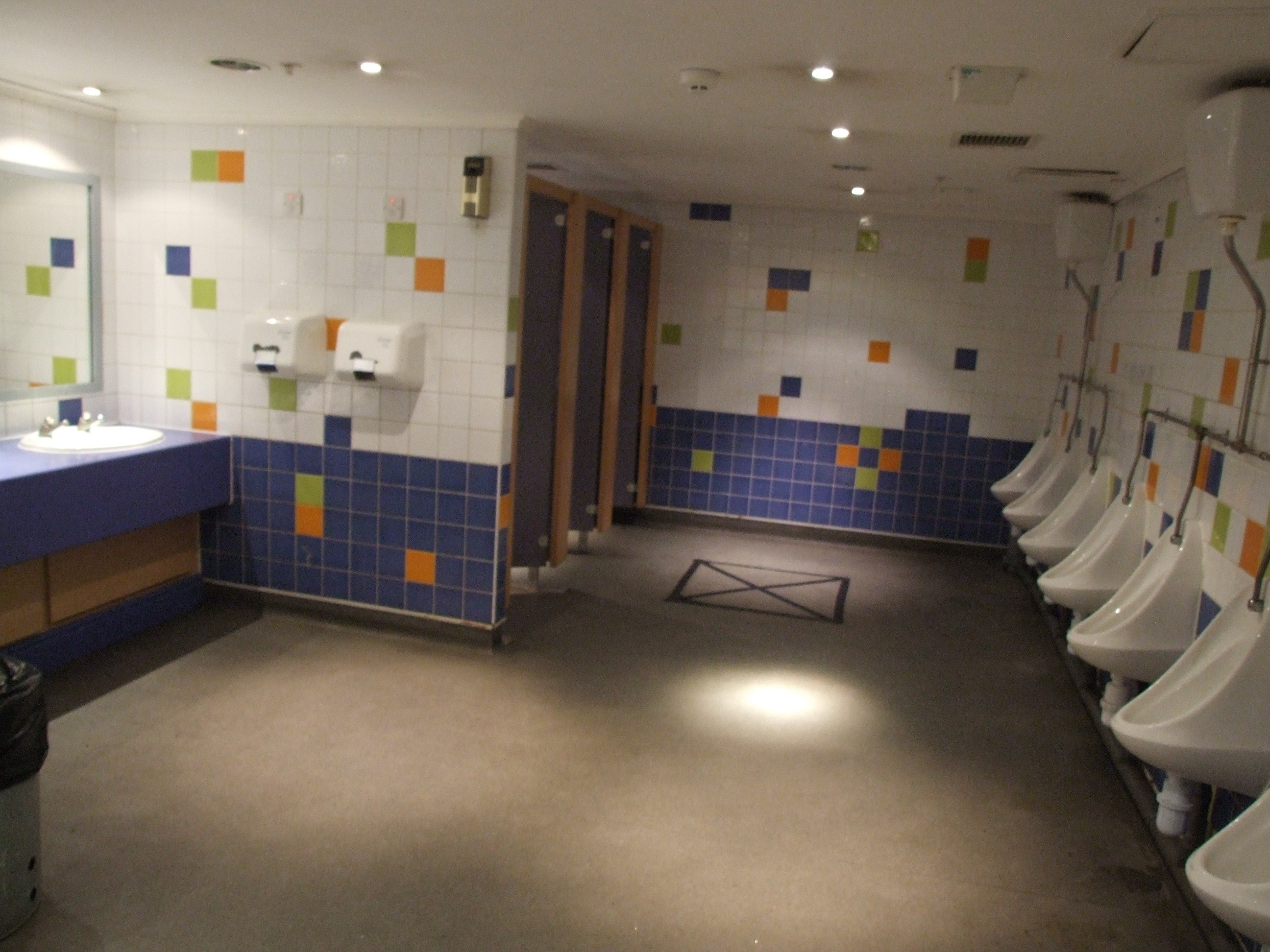 That large X on the floor near the stalls, does it mark the spot? It's as if they almost started with a pirate theme for the restroom, but then gave up.
