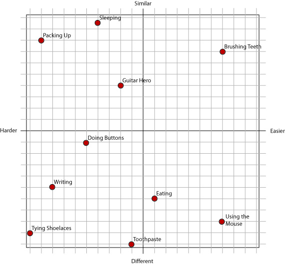 I could detail the rest of my day in such anal detail to broe the tits off you, but I won't. Instead, see this handy little graph I plotted of everything I did today, against ease of said task and difference to doing the task with both hands.