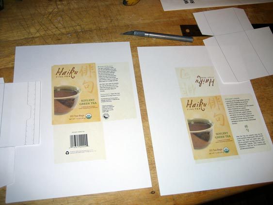I don't know if you're familiar with the store Whole Foods, but they sell all manner of organic and hippie-friendly items. I wanted to play on this idea, and it occurred to me - what would be better than green tea? SOYLENT green tea! I purchased this box of real green tea in order to use it as a template for my project.