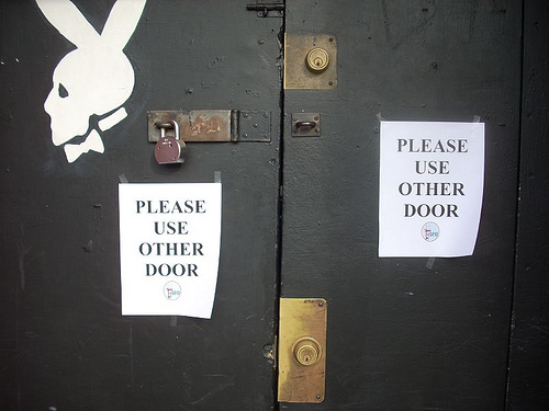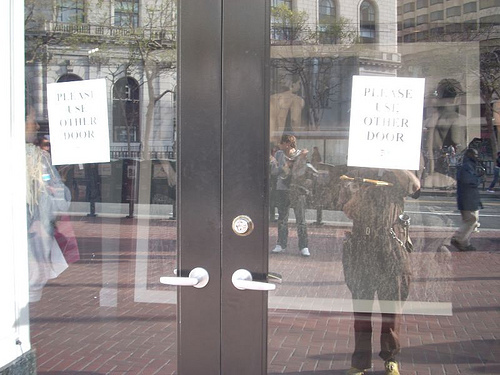 It was at the public library. I was a little dumbfounded and quite amused. "Which other door?" I thought to myself. It reminded me of the childish game where someone makes a card and on one side it says "How do you keep an dummy amused? (Flip over for answer)" and on the other side it says "How do you keep an dummy amused? (Flip over for answer)".
