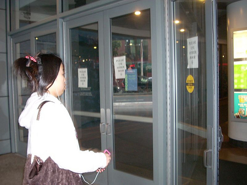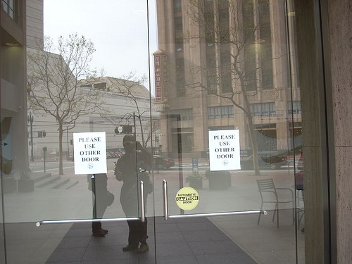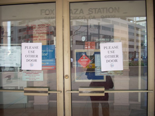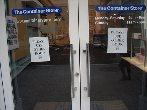 So let's come back to my exit from the large "drug store". I had my WD-40 and tape. My clipboard. And lots of sheets of paper with "Please Use Other Door" printed on them. By now, you likely know what I did.