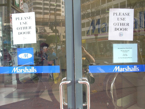"Yeah... they said market street side. 1170. I'm going to put these signs up. Make sure people don't use these doors for a while."