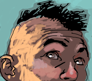 What's he looking up at? Or is it that whole OH GOD MY FLY IS STUCK face?