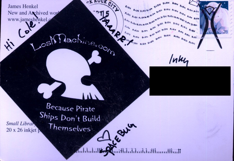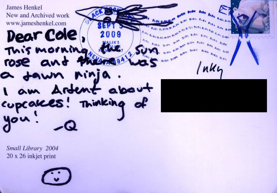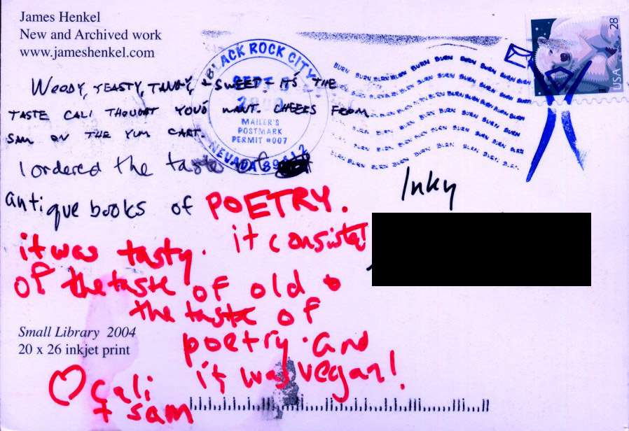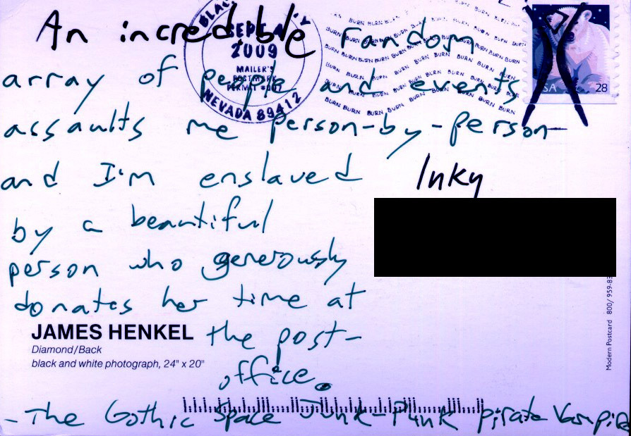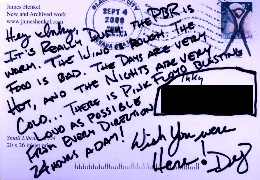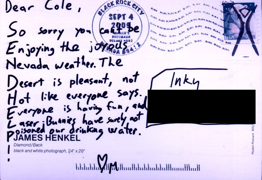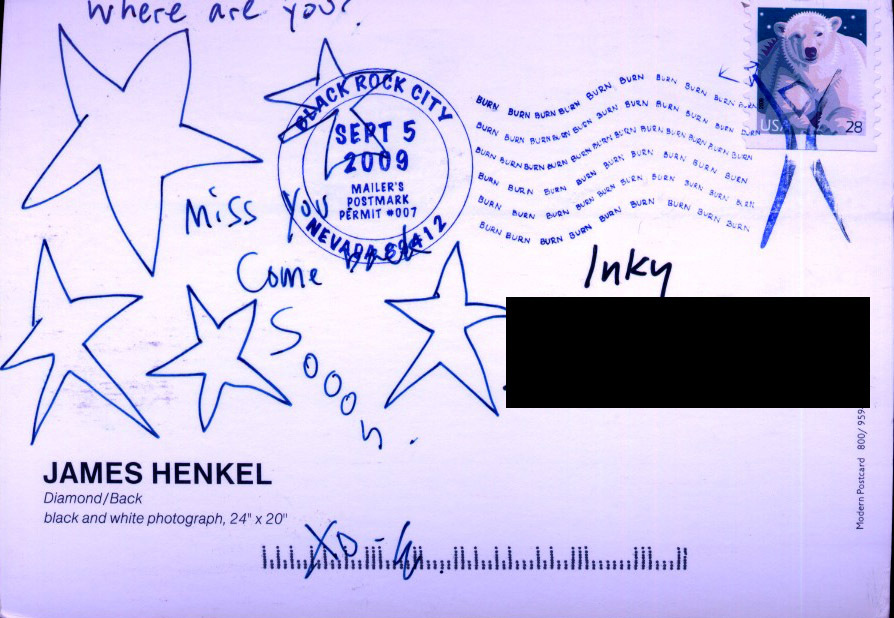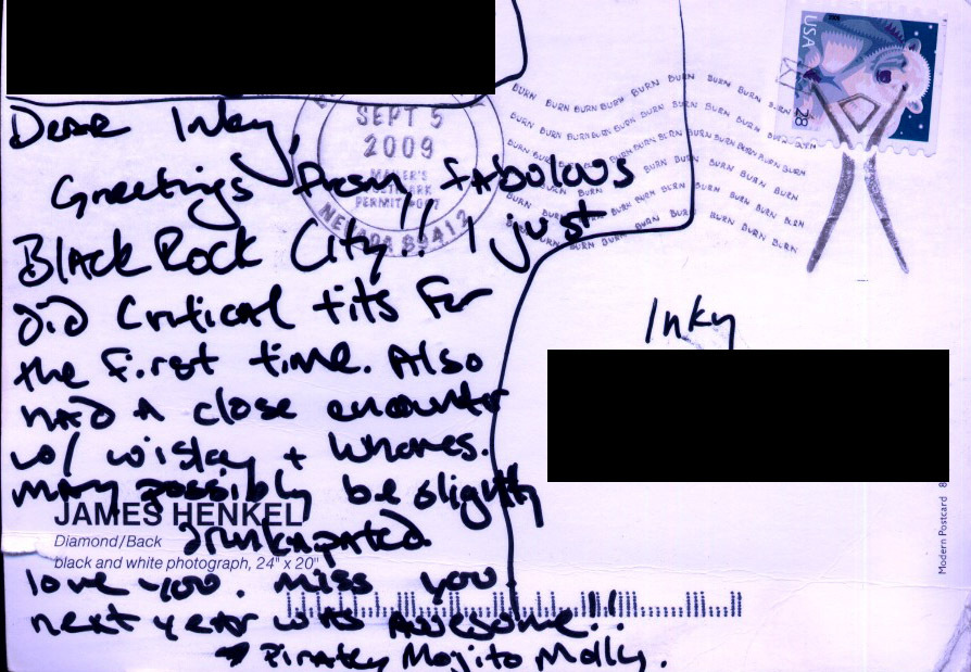 I returned again in 2006, trekking out a week early with Star5 to help the Center Camp Cafe do set up. I have not been back again, though I have wanted to. This year, we were split about half and half, those of us who did not go, and those that did, and it occurred to me, to send something in my place, as my friend Danger D. Hotrod had, many a time before. But what could take the place of Inky? What would be open to new experience and voices, thirsty for words, willing to piece itself apart and take on new people in spite of all of its shyness? Postcards, my loves.