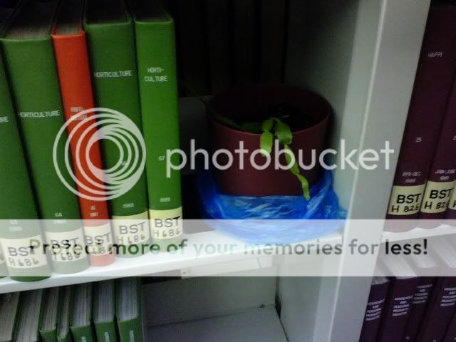The plant might not be there anymore, but the bookends still should be (I put one there, one in the IEEE section, and a couple others in that aisle as well).