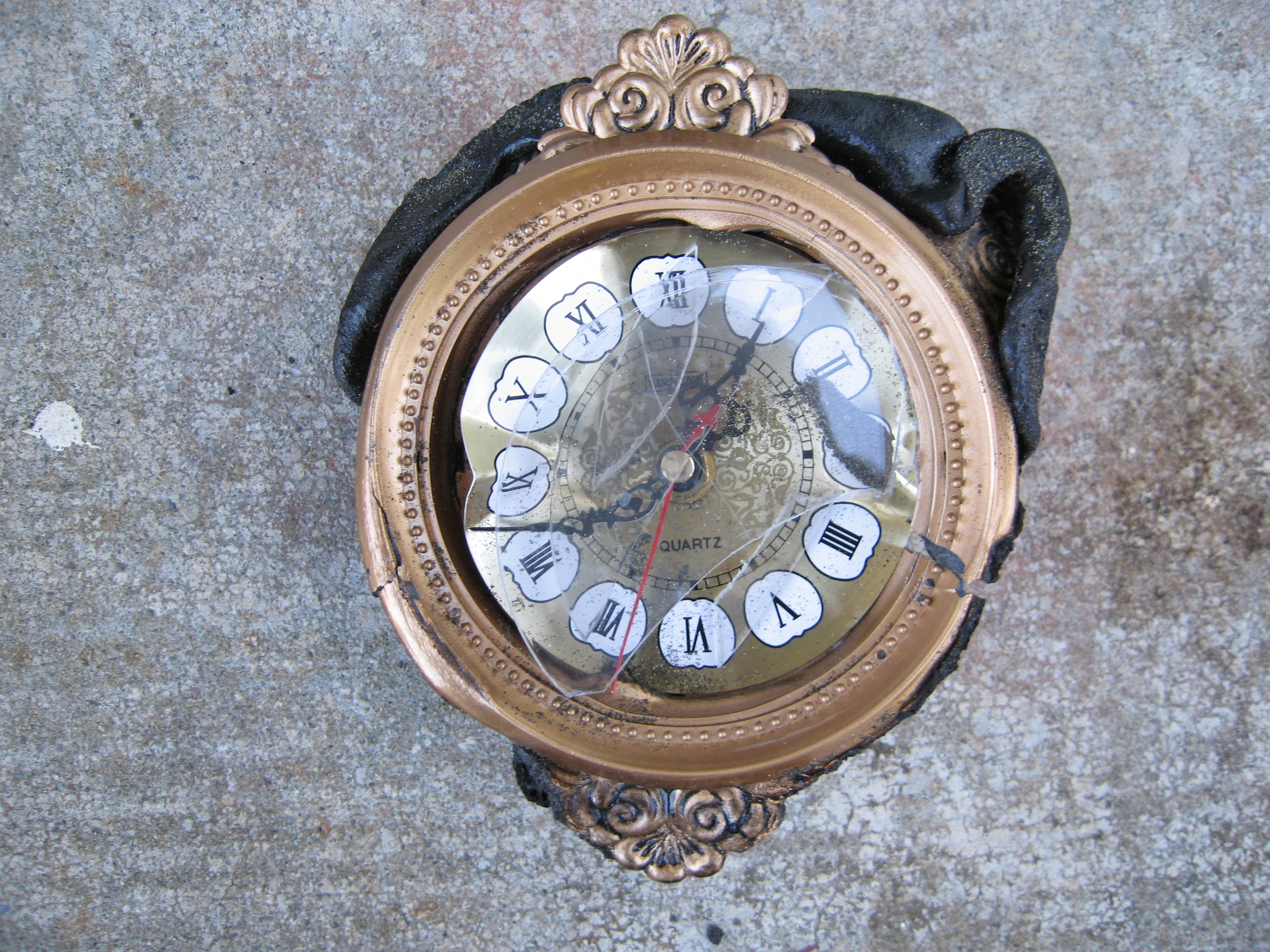 We actually found this clock sitting on the corner where they usually only put broken chairs and old stinky matresses. I sort of loved it too, but the more I looked at it and tried to figure out what to do with it, the more dead it seemed. Then this task came along, and we gave it a good viking funeral!
