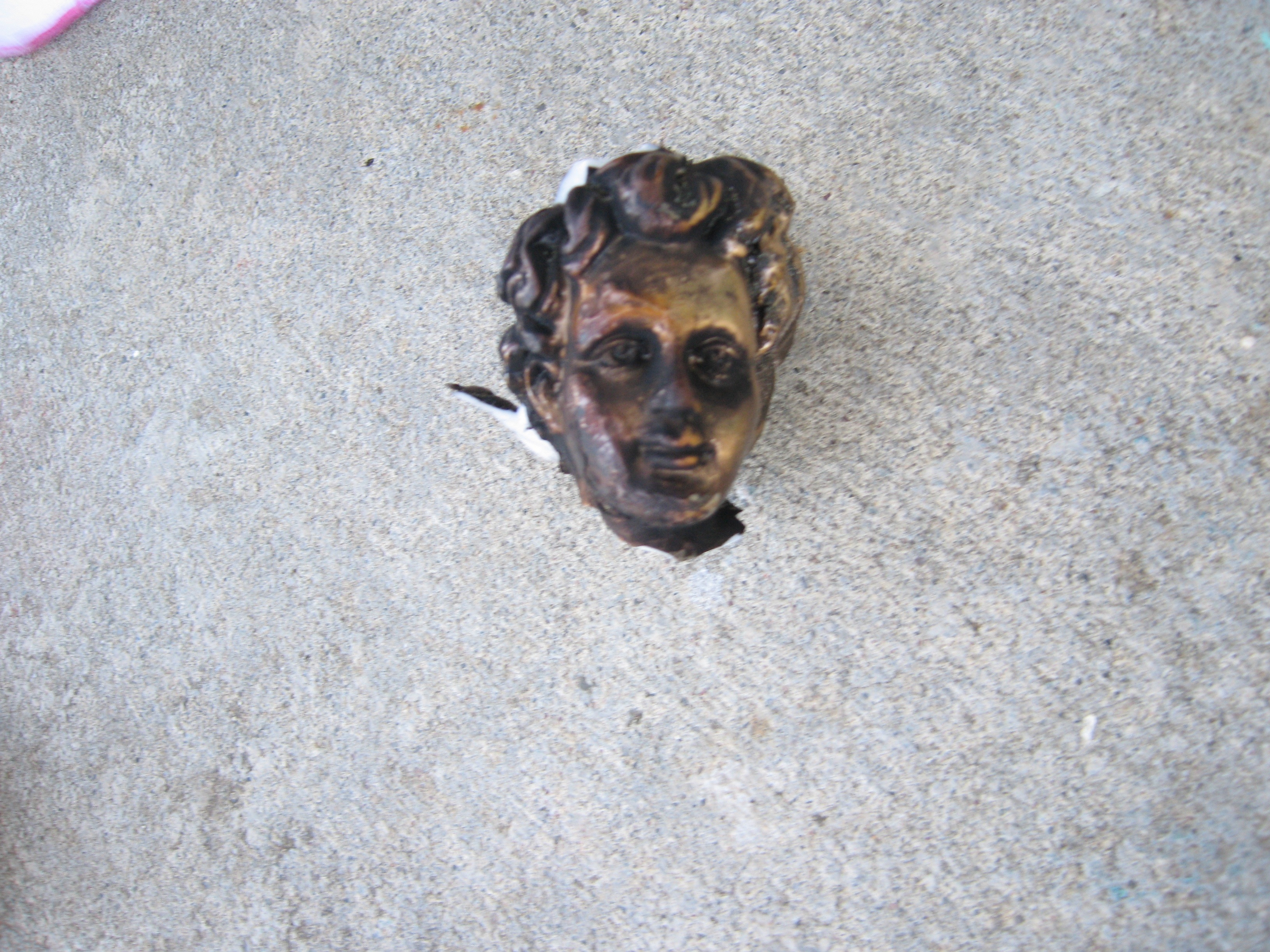 Then John was feeling left out and wanted to artificially age the statue part even more. He borrowed Evie's hammer and gave a great whack. He did very well. Again, I show, I do not tell.