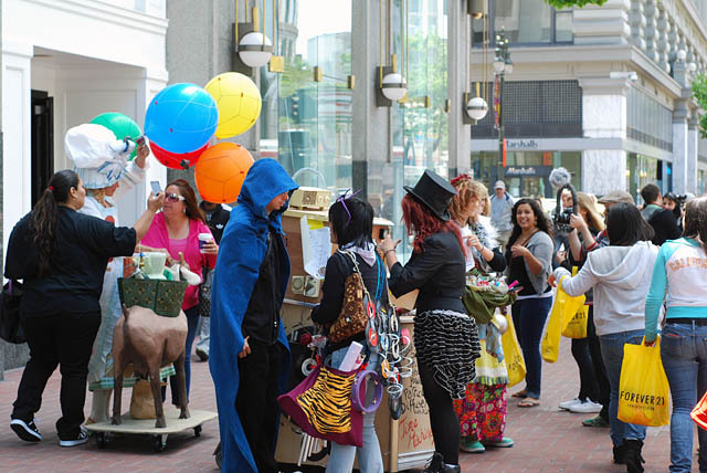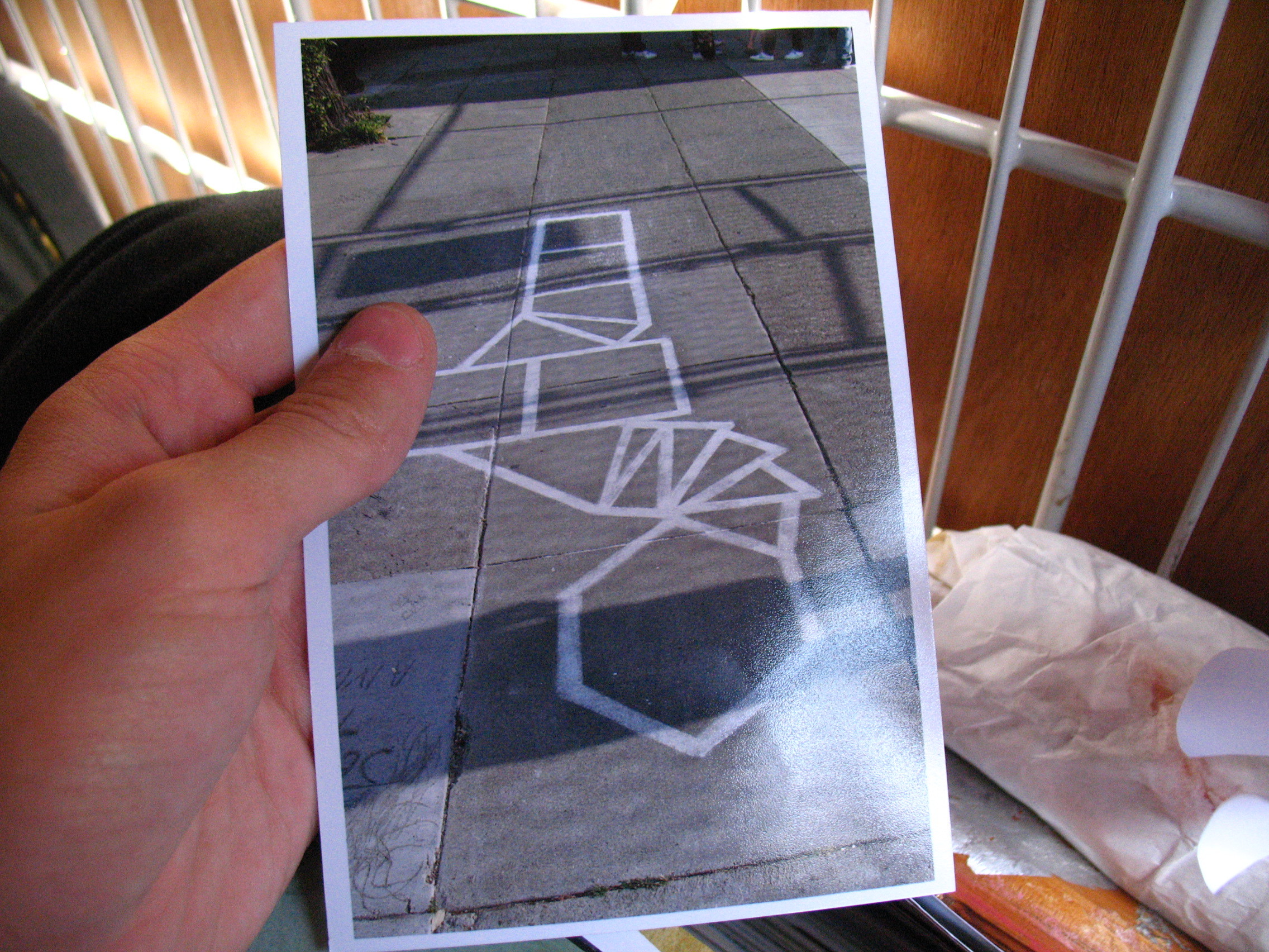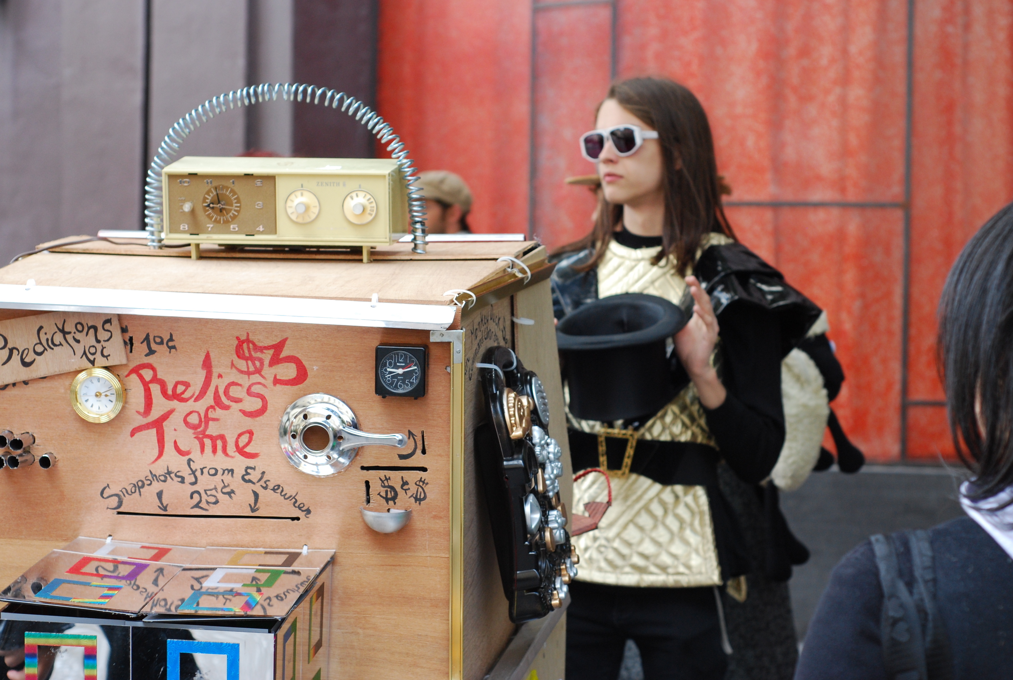 We fashioned signs for our time machine, showing our wares: Predictions for ten cents a piece, photographs of other times for twenty five cents a piece, and artifacts for three dollars. Our stomping grounds were around the city, but mostly along the commerical portions of Market Street.