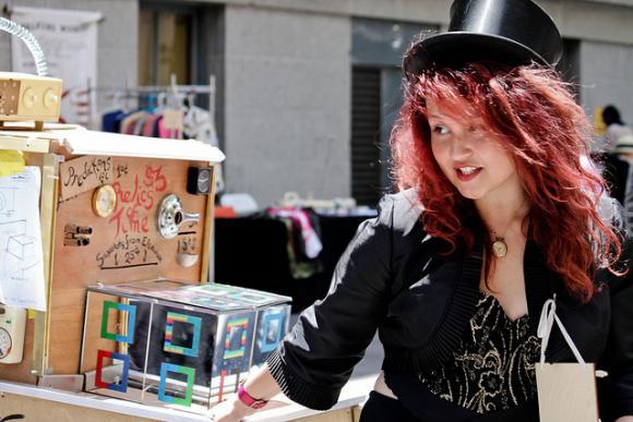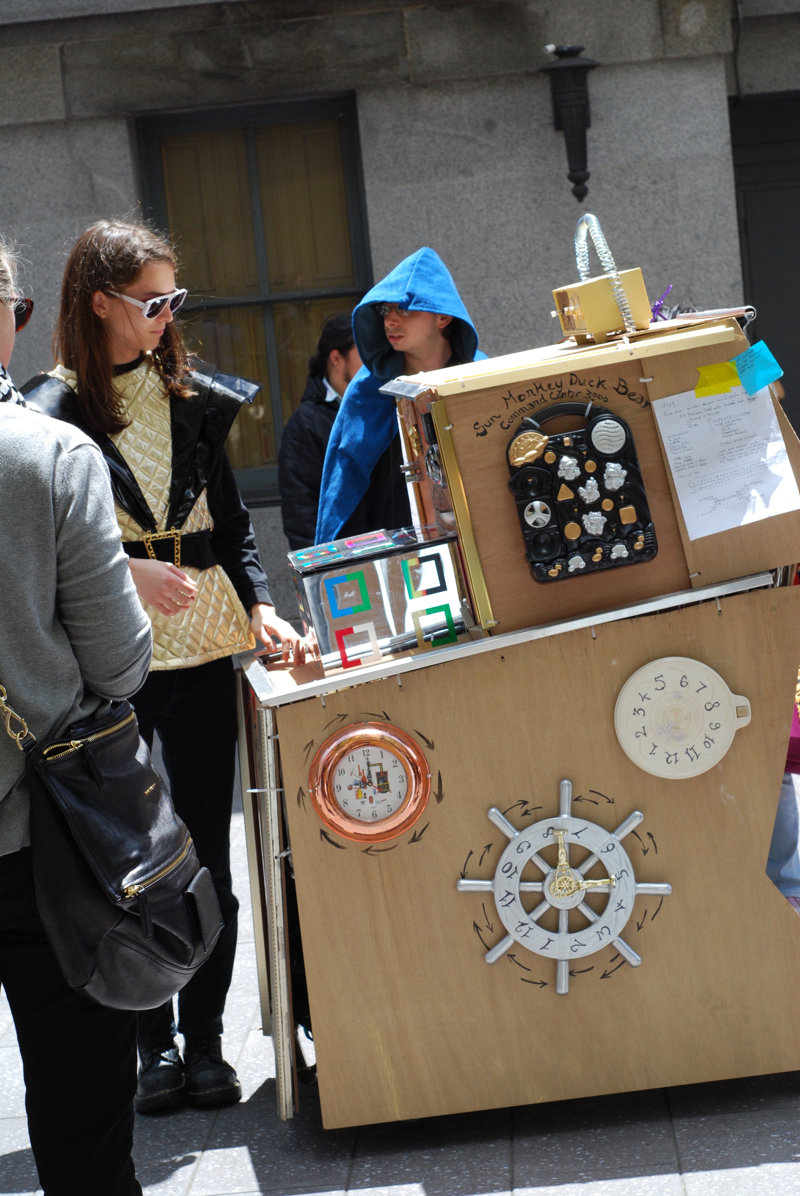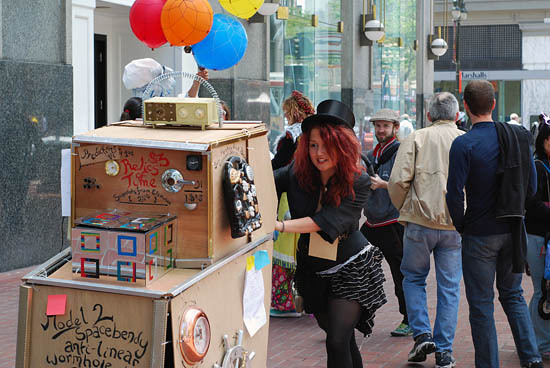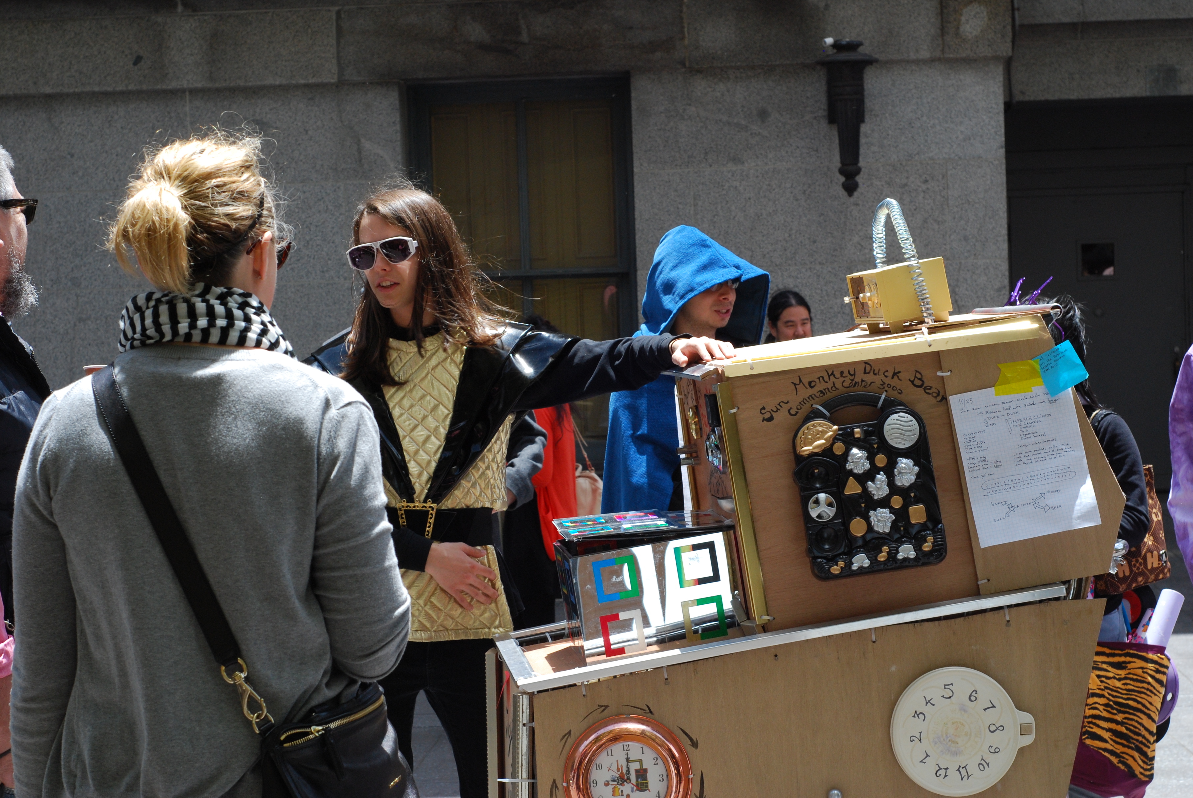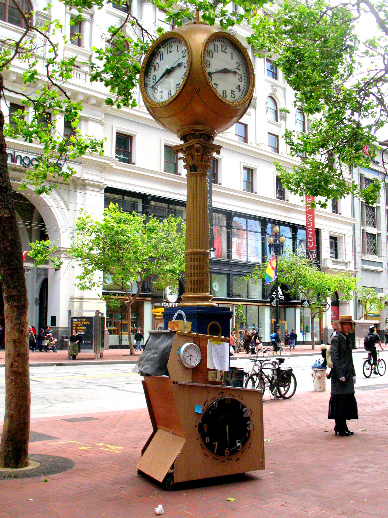 Our machine, our lifeboat out of Orwellian hell, was the Model Two: Spacebendy Anti-Linear Wormhole Powered Particle Diffuser (With a Coil!) This trusty vessel was easily flown from the eighties all the way to the twenty first century, a time that looked like the stone age to our future eyes. After a few simple repairs in Southern Exposure we were ready to travel again. Unfortunately, we were also penniless. A plan hatched in our eyes: Tourism! We could give the population tours through time! But that would be stupid, we had no other way to create a new time machine, and if the tourist messed up just one circuit, we would be without a way out of 2011. Instead, we figured that we could just find bits and pieces of time, artifacts, take a few pictures, use our powers of prediction, and make a few bucks while we were at it to live for a while in San Francisco, the town we grew up in, looking at a better and brighter time, and for an even better one to relax and work in.