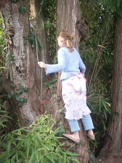 Evie decided the story pieces should be worn, so she ran around with a skirt of story parts draped at her waist. Bryce was happy with his hat and scarf.