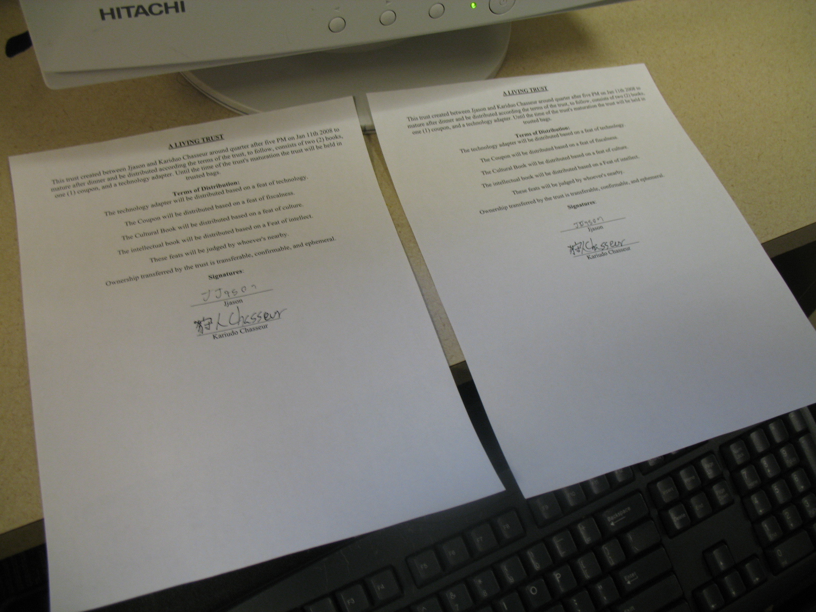 Anyways, once we'd gotten all of these assets together, we had to decide the terms of the trust. We quickly decided that the trust would mature after dinner, given a desire to bring this trust to maturation before the end of the era, so we just had to decide how to divide up the items. After some brainstorming (Kariudo suggested we divide them up by height. I disagreed) we finally decided to divide up the assets based on a series of feats, which would be judged by "whoever was nearby." The textbook would be assigned based on a feat of intellect, the Japanese hip hop book by a feat of culture, the coupon by a feat of a fiscalness, and the adapter based on a feat of technology. Having agreed to these terms we wrote up our agreement, printed out too copies (one for each us), and signed the suckers. All very official. Now we just had to wait for the trust to mature.