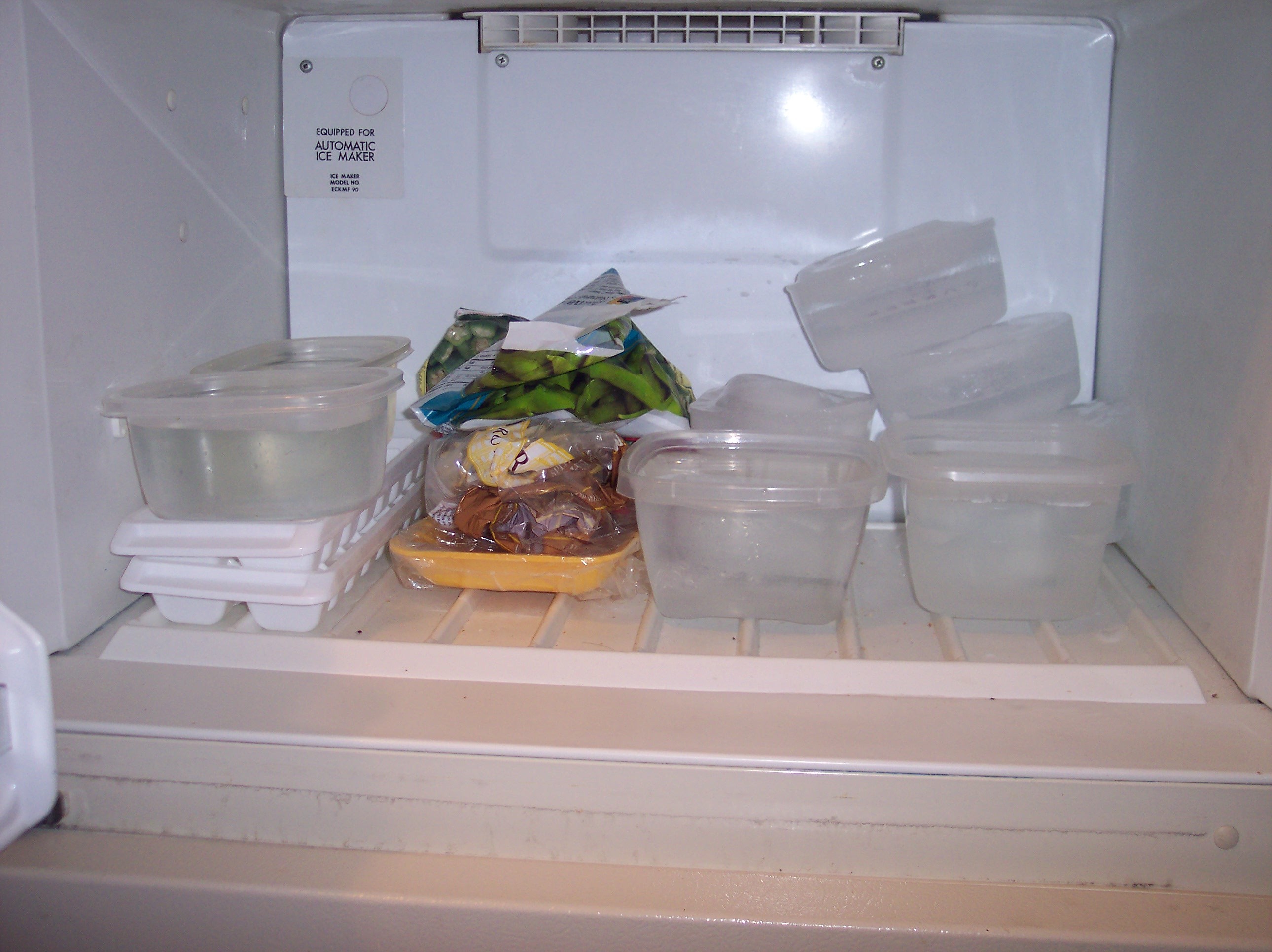 There was a little bit of trouble in freezing the notes - they naturally wanted to float to the surface. I got around this by only filling my molds (I used tupperware) halfway, letting it freeze the note in place. Then I'd fill the other half with water and let that freeze. Actually it didn't work out that way because the ice would float. So I had to take the ice out, flip it over, fill it back up again, and then let it freeze. This lead to slightly lumpy blocks of ice, but it was ok. I used two small containers and two large ones, so there was two different shapes of ice blocks. Once the notes were frozen in place, I made another four blocks for structural purposes. Removing the ice was no trouble, so I just piled them all up in the back of my fridge.
