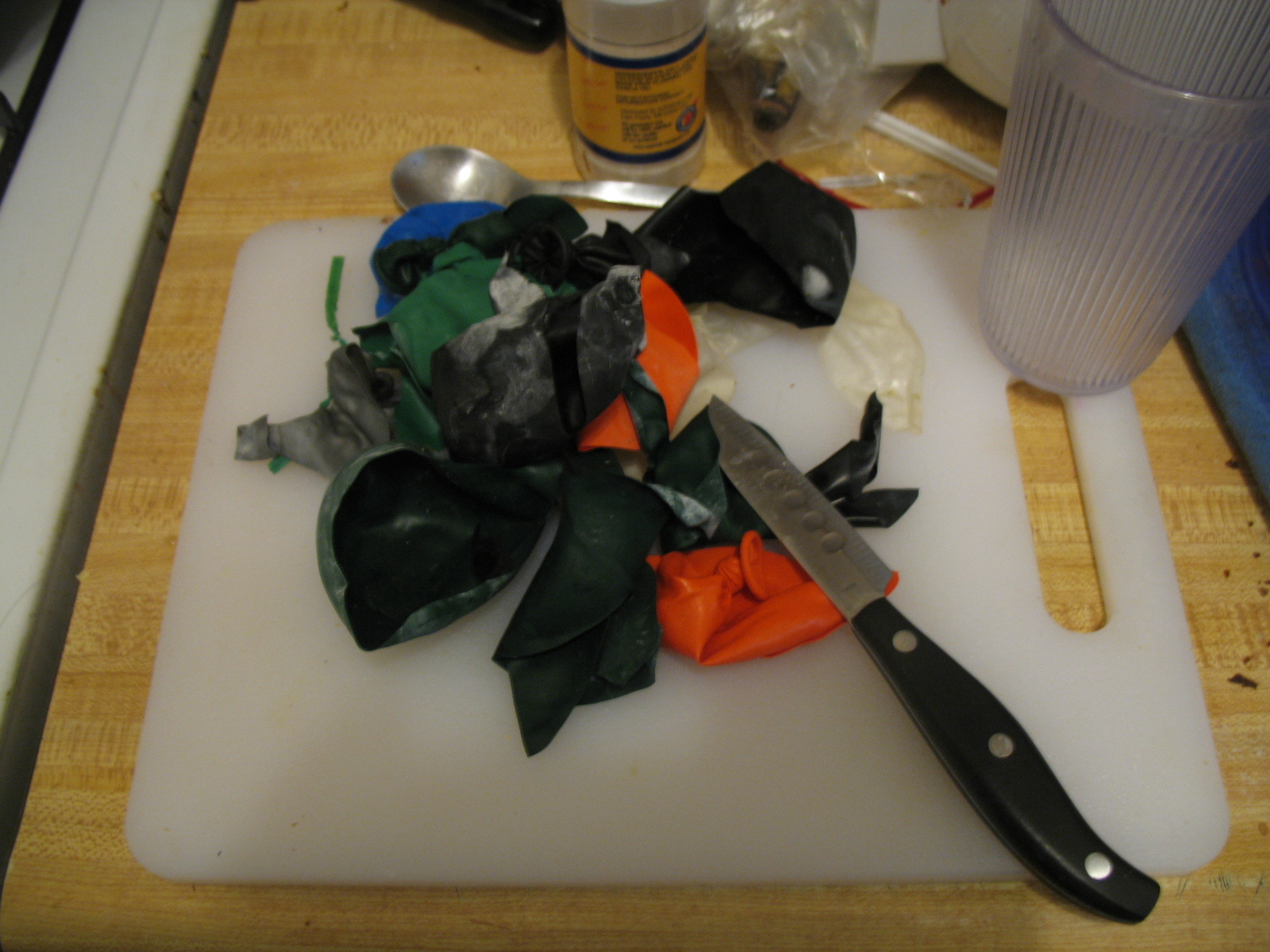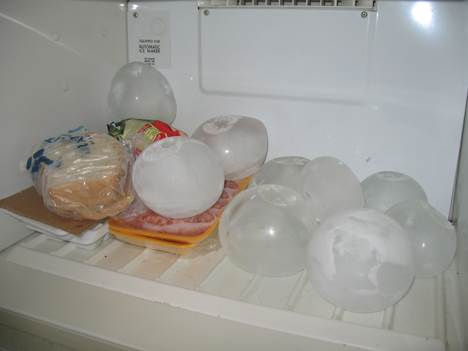 Having finished research and development, it was time to ramp up production. I filled ten balloons with varying amounts of water and left them in the refrigerator overnight. My fridge actually wasn't large enough for all the balloons, so I ended up having to leave two of them outside (I'm glad it was only two - the ones I left outside ended up much murkier than the inside ones). When I got up the next morning, I simply cut the balloons off the ice, put them all in a bag, and set off.