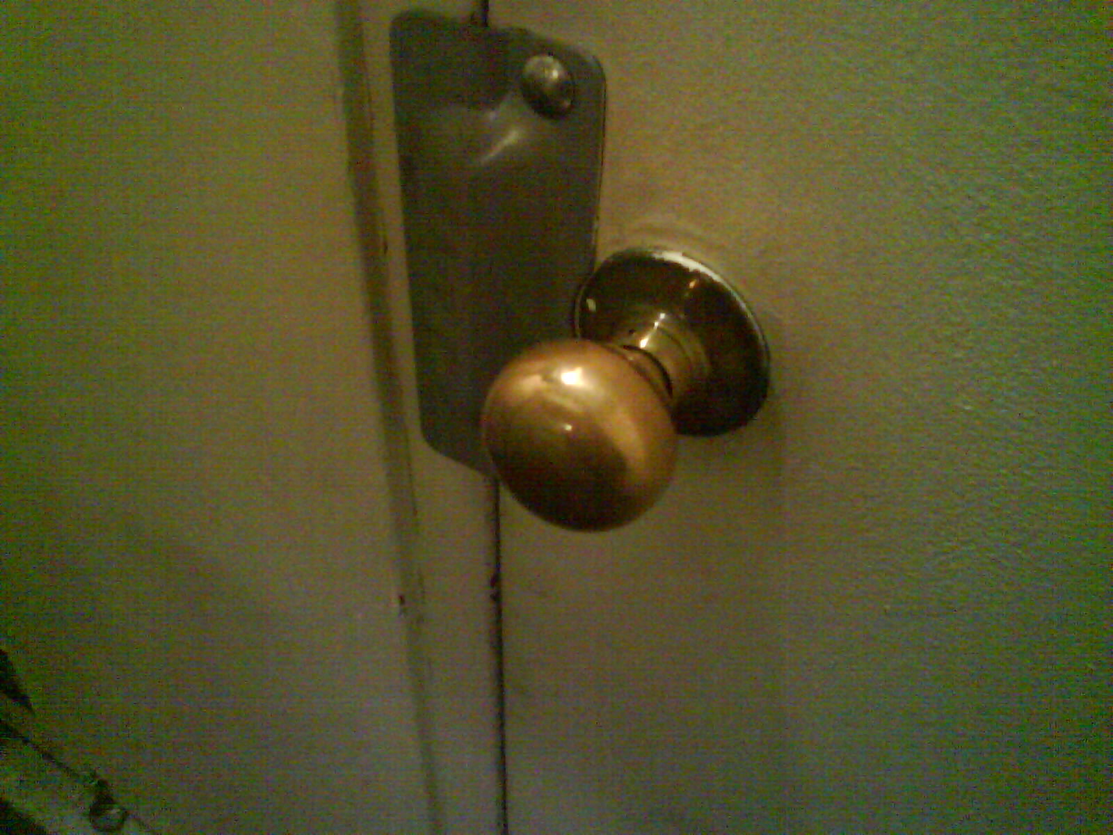 This doorknob didn't seem to actually be connected to anything. It would just turn and turn. Notice the metal plate - the door swings inward.