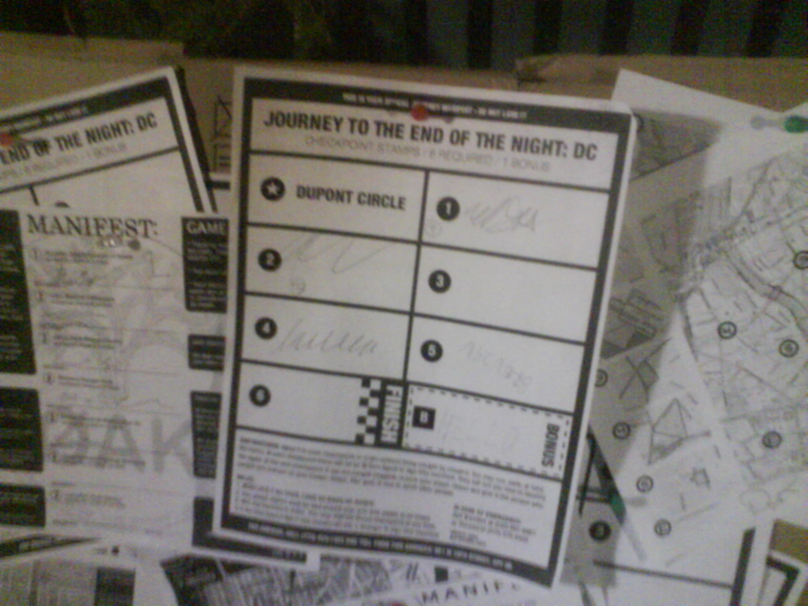 I showed up at Prospect Park much too early, around 6:00. For about half an hour I waited around until Shea Wolfe showed up and then we waited fifteen minutes more until Burn Unit showed up. Then we all waited for the ribbons and manifests to show up, as players slowly started to trickle in. Ribbons and manifests didn’t show up until 7:30, which made both Burn Unit and I very anxious. On the plus side we actually picked up a checkpoint three during this period – we had previously planned to have it unmanned but someone came by and said that they were interested in being a checkpoint agent. We sent him off with a location and we were set.