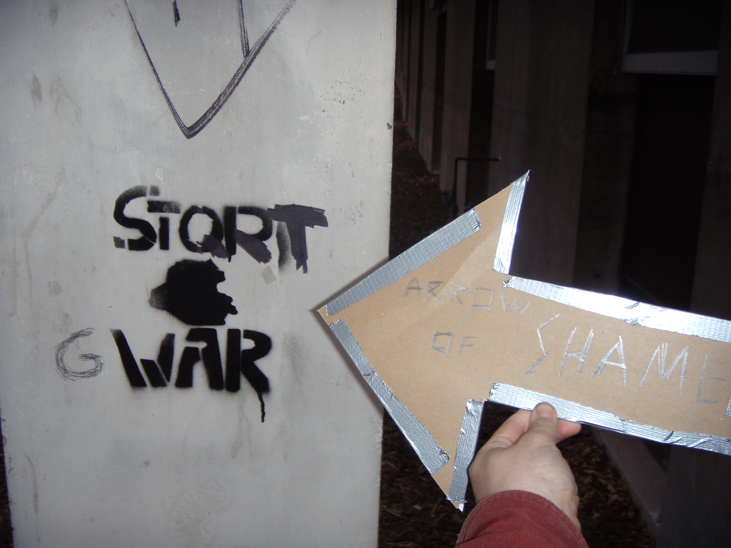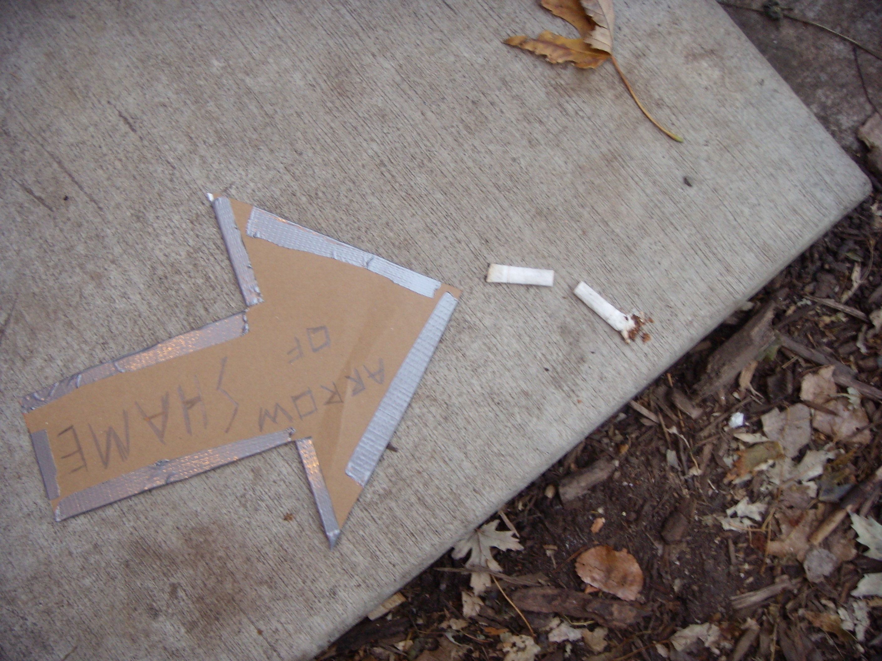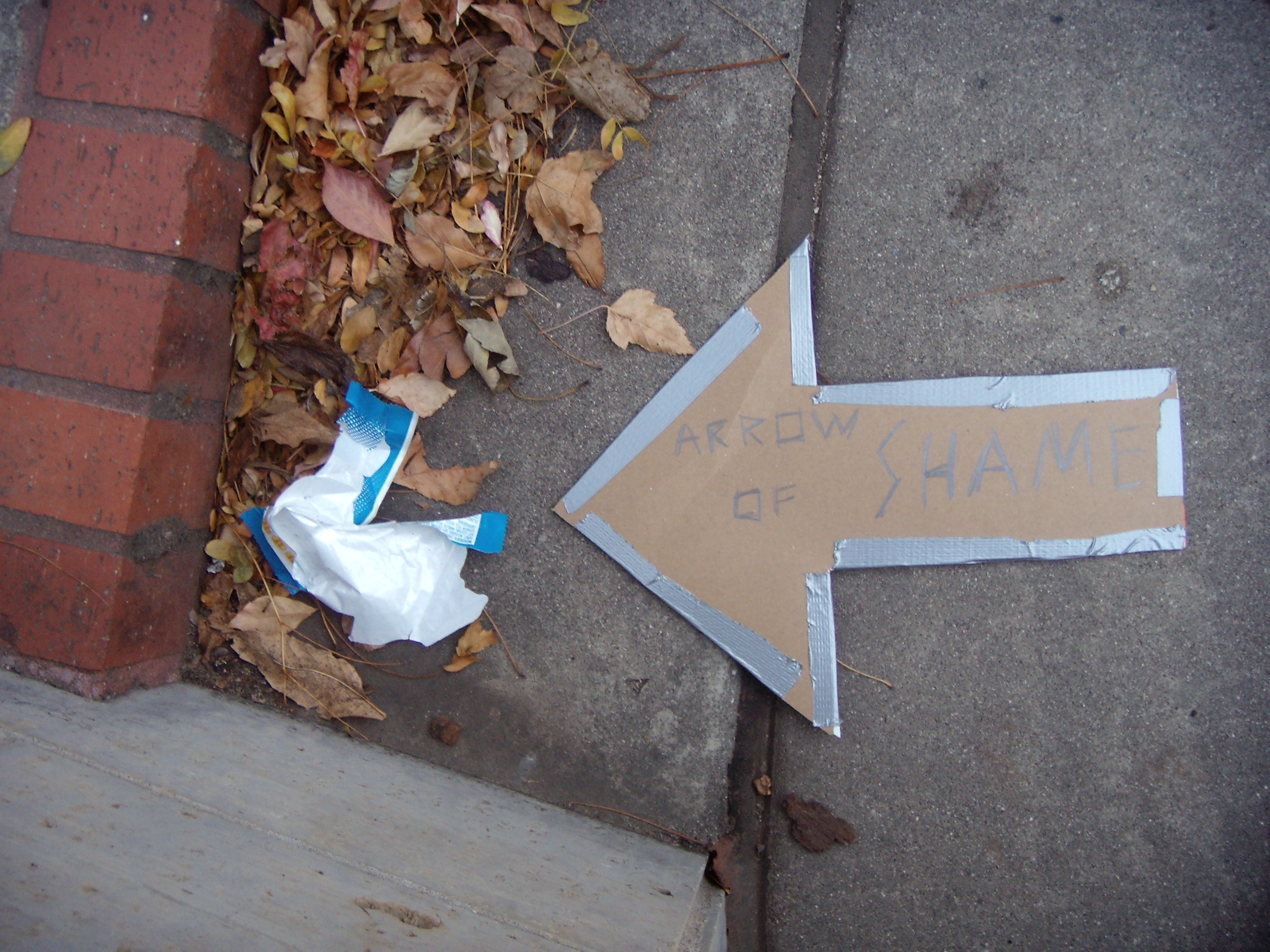 November 20th, 2007 2:30 PMHaving got my arrow, I set out to find some social disgraces to call attention to. I mostly focused on litter, with the occasional graffitti and Peter Harmon to also shame. See the results in the pictures below.