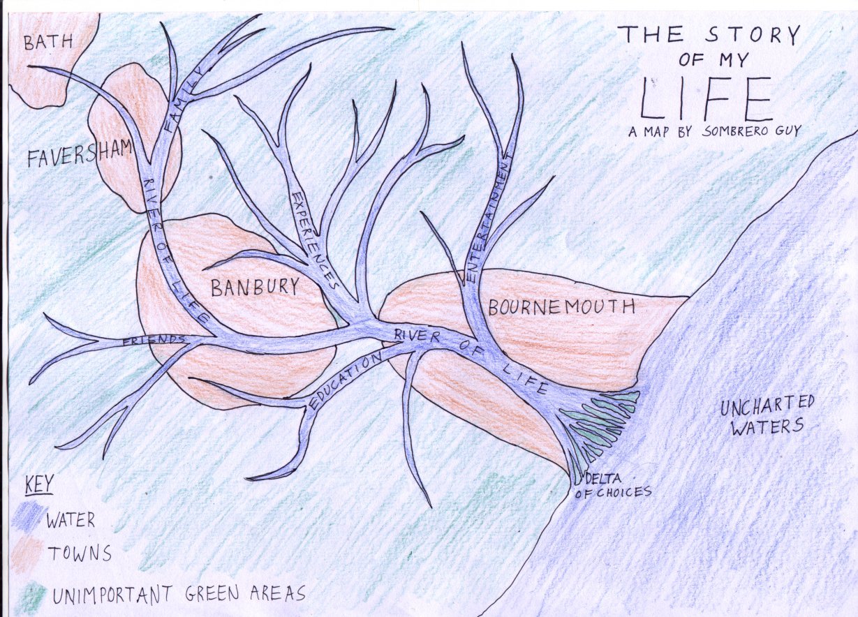 The main idea was that the map would follow the path of my life, represented by a river, through the towns I have lived in. I then thought it would be good to add on tributaries of the river, showing things which shape a person's life flowing into the main river.