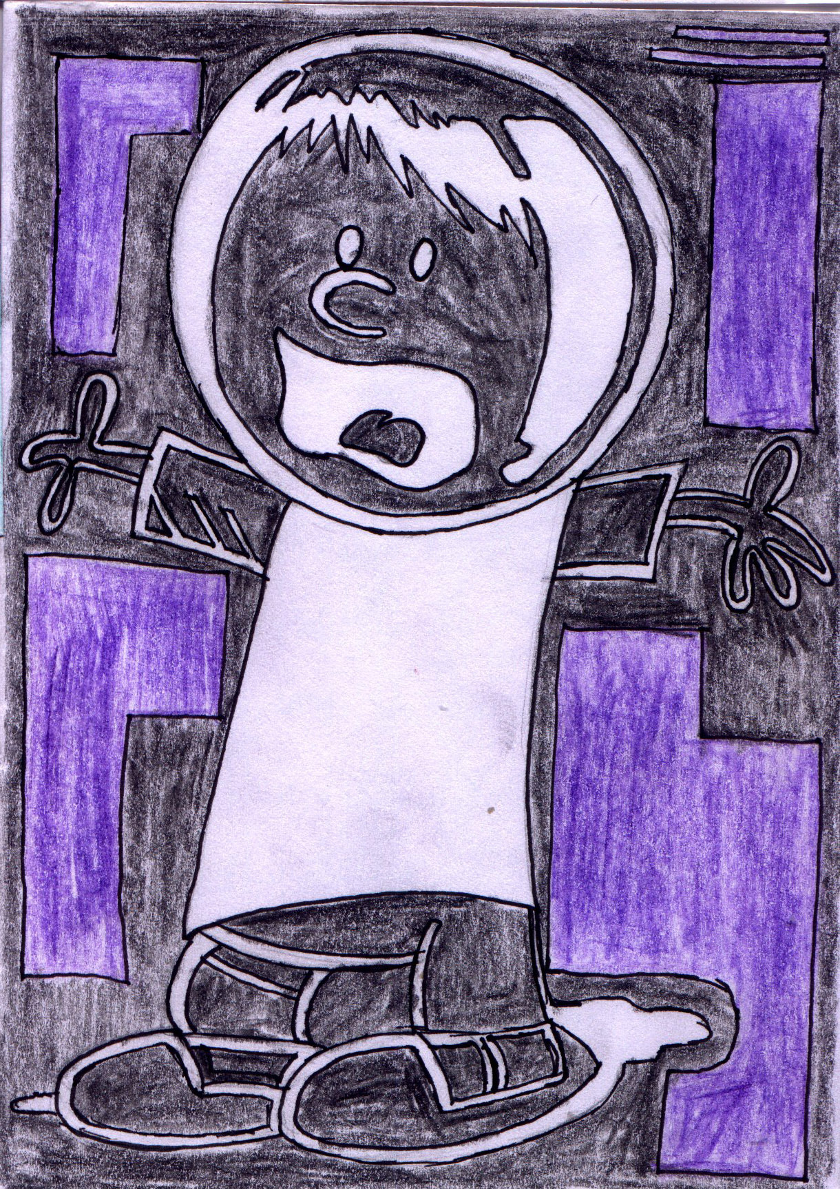 At first I thought a cartoon character would be easier to draw than real people, but then I got confused trying to keep the white outlines, so I ended up with ink lines all over the place around the legs and feet. Even so, it didn't turn out too badly.