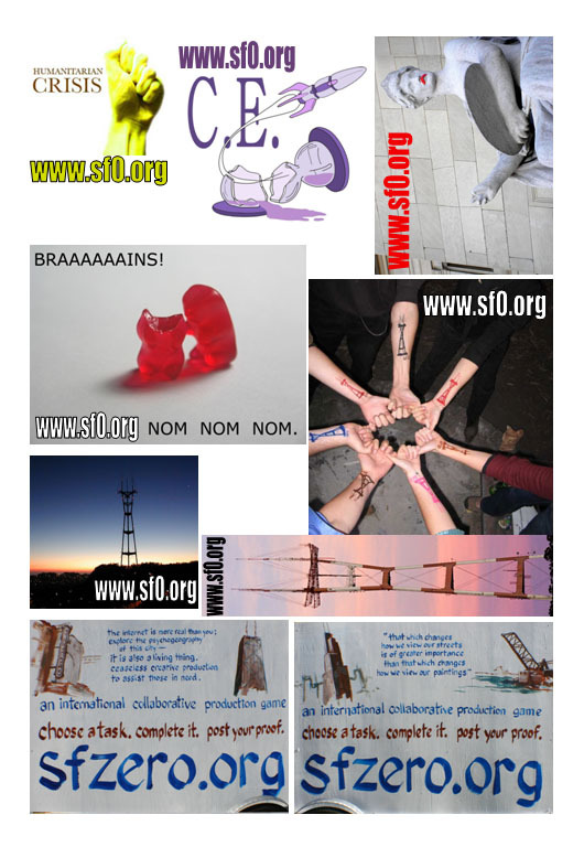 To do this, I made some small labels, which I could stick up whenever I went out somewhere. I collected together the logos of all the SF0 groups, together with the main logo and my two BMTHØ logos and put them on a Publisher document. I then found some images from my favourite tasks, or just pictures which would look interesting, from the game. I also found two nice photos of the Sutro Tower.