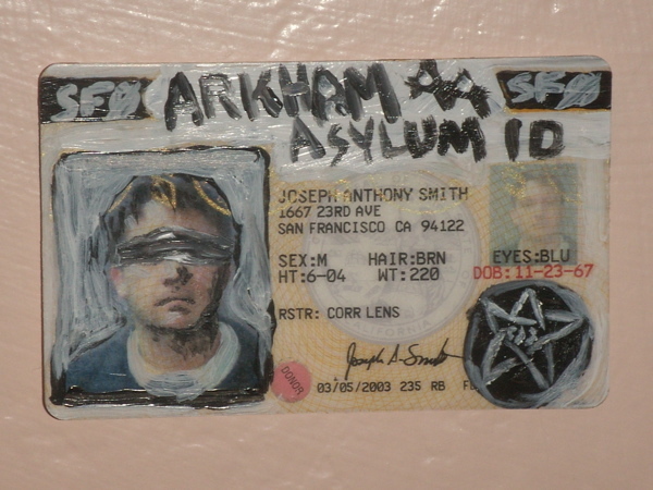 I started with altering my image, using black and white paints to increase the contrast on my face. I didn't really feel much like facial hair, but somehow an ID with a blindfold seemed... interesting. It ended up looking spooky, reminding me of the stuff from the Cthulhu Mythos that my son and I have been playing with of late (we are new players of Arkham Horror, as an example), so I plugged in an Elder Sign over the California Seal and added "Arkham Asylum ID" over the top (Arkham Asylum also appears in the Batman Mythos).