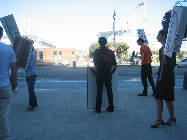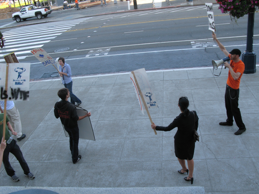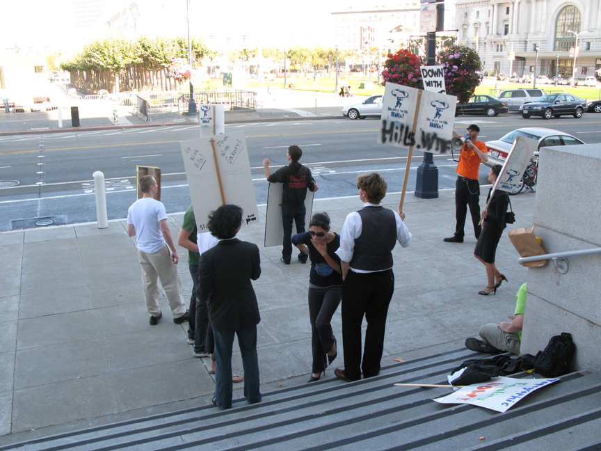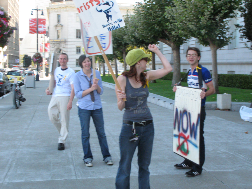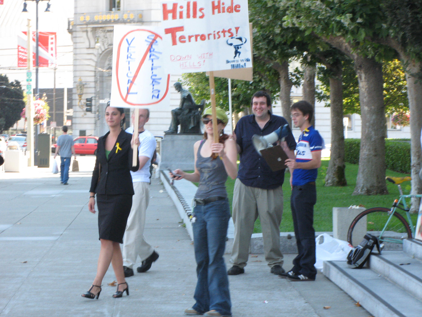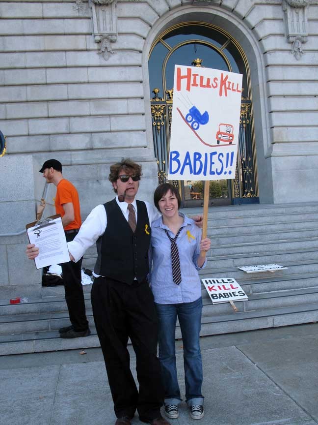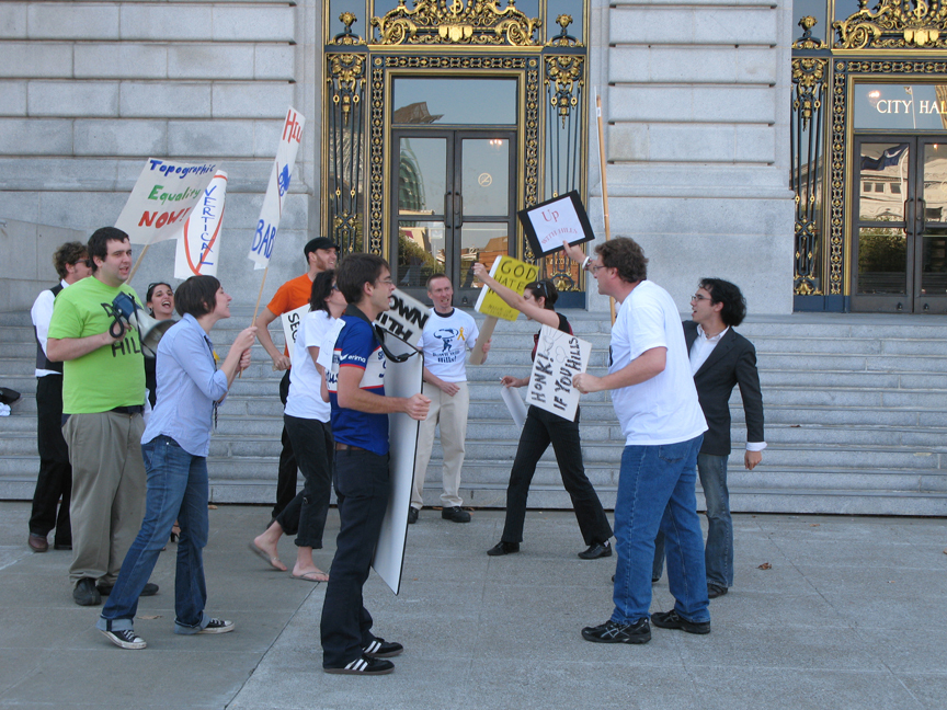 This conflict hit very close to home for me, because anna one, who has been a close collaborator with me in the past, stood on the other side of this battle. Whereas I called for a leveling of the playing field and painted signs and shirts that declared said intent, she staunchly stood up for the hills of San Francisco. The bitterness that raged between our factions from either side of the Steps of City Hall was nigh heartbreaking. Only nigh because while on that street, we were each fueled by passion for our respective causes and the comraderie of our brothers in arms. Who knew that something as simple as a false moustache could allow us to set aside our differences and bring us together again? Oh and the booze helped, too.