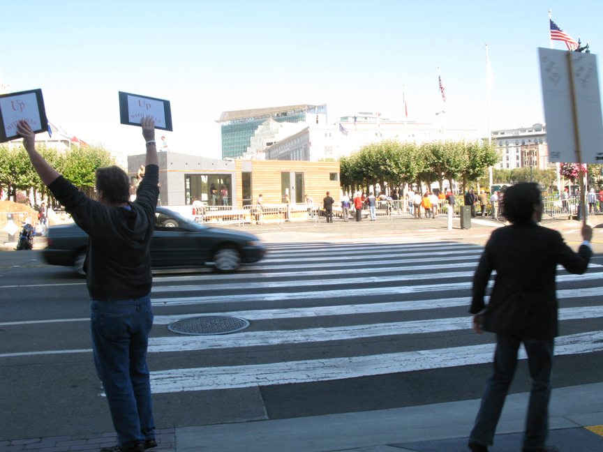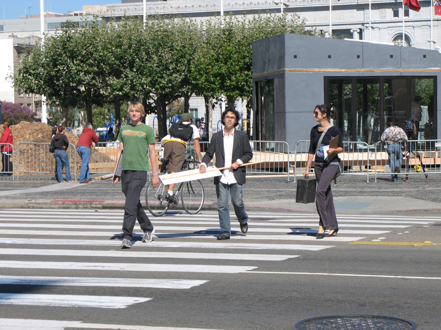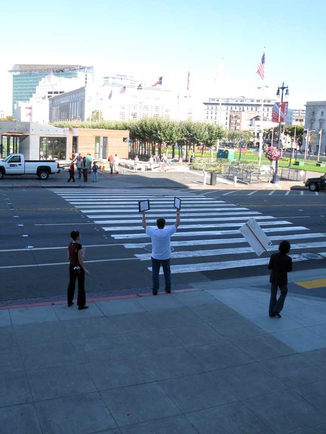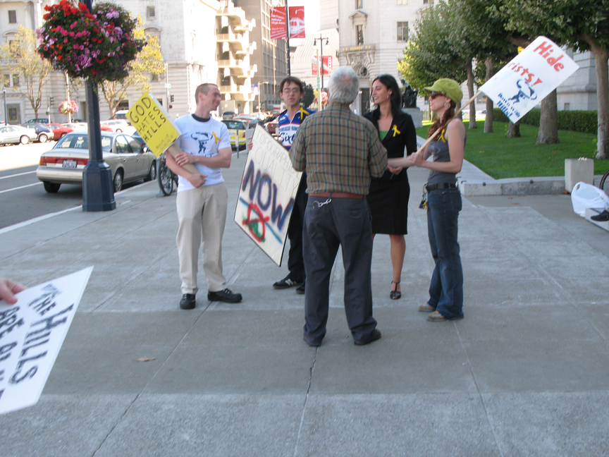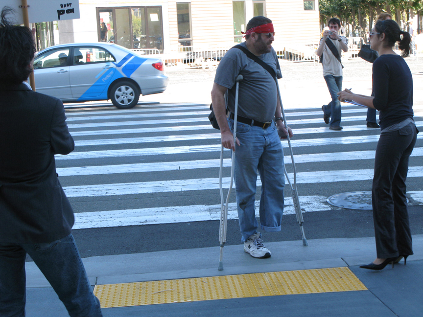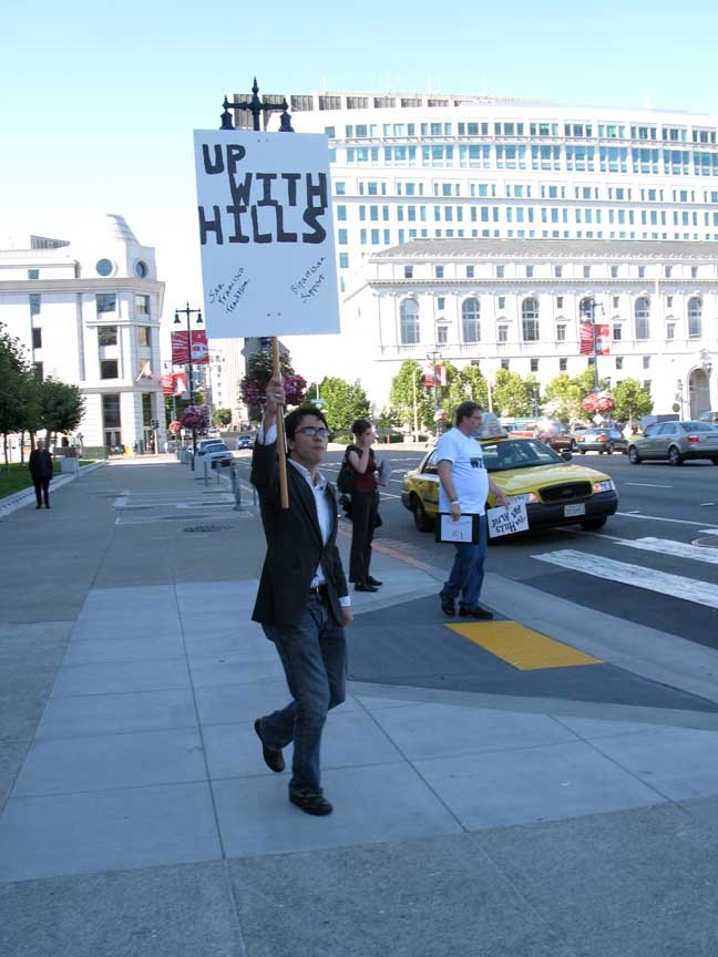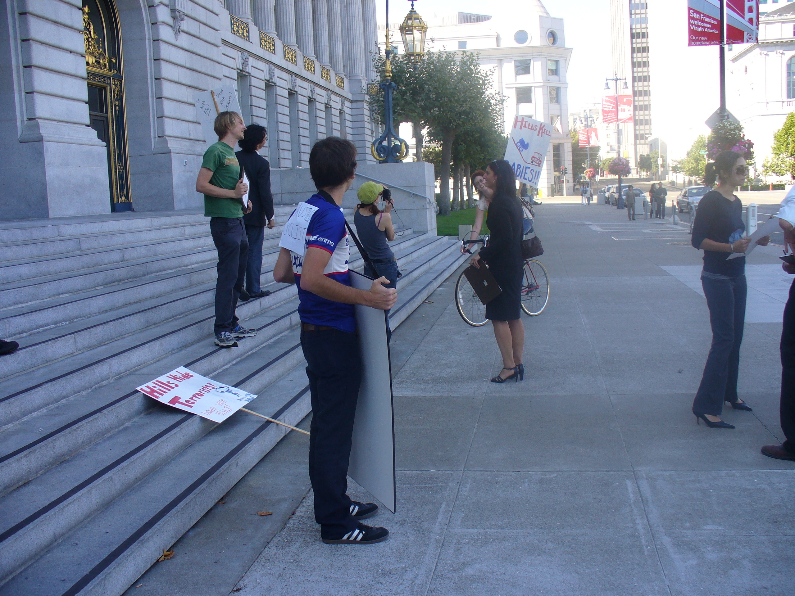 This conflict hit very close to home for me, because anna one, who has been a close collaborator with me in the past, stood on the other side of this battle. Whereas I called for a leveling of the playing field and painted signs and shirts that declared said intent, she staunchly stood up for the hills of San Francisco. The bitterness that raged between our factions from either side of the Steps of City Hall was nigh heartbreaking. Only nigh because while on that street, we were each fueled by passion for our respective causes and the comraderie of our brothers in arms. Who knew that something as simple as a false moustache could allow us to set aside our differences and bring us together again? Oh and the booze helped, too.